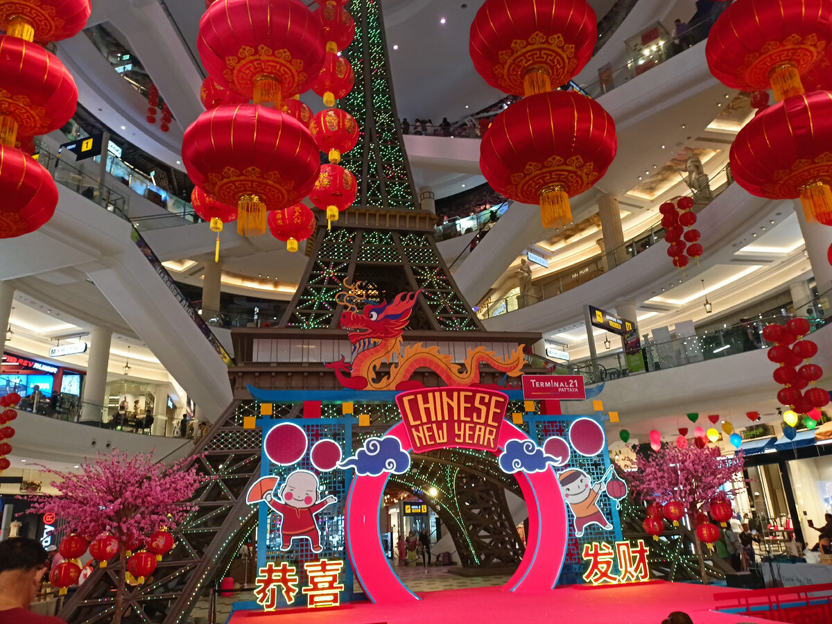 Трескучие погремушки с самого утра. Гирлянды бумажных фонариков в торговых центрах. Весёлые толпы на улицах Паттайи... Если 9 февраля на улицах грохотало и дымило (это был день наподобие 31 декабря), то 10 февраля китайцы более-менее спокойно собрались на площадке рядом с Terminal 21, чтобы посмотреть на танец золотого Дракона. Коротко говоря, этот персонаж в новогодней китайской мифологии символизирует всё хорошее и выступает против всего плохого. Дракон сначала прятался под Эйфелевой башней (известной достопримечательностью Паттайи), а потом вырвался на свободу. Китайцы и прочие неравнодушные граждане окружили его плотной толпой. Видео с танцем Дракона я выложила вот здесь: Как видно на фото, Новый год положено отмечать в красном. Китайский Новый год окутан многочисленными тайнами, легендами и страшилками. У бассейна в своём кондо я встретила пожилых соседок, которые приехали в Таиланд на пару недель. Туристический гид велел им два дня никуда не выходить, потому что, видите