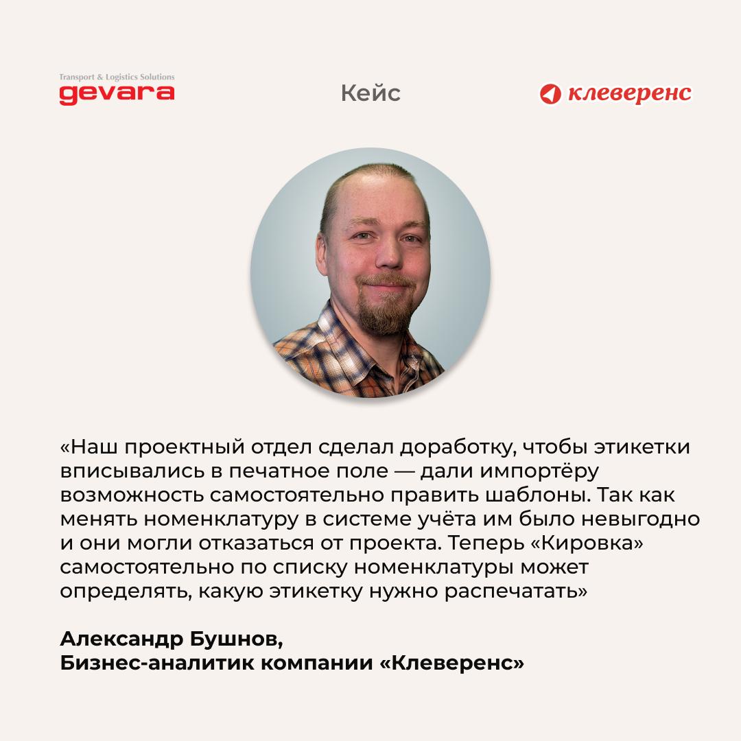Евгений организовал сначала конференцию с партнёрами — чтобы мы могли обсудить какая система учёта у поставщика, каким способом будут выгружать GTIN-ы, какие отчёты сотрудники компании GEVARA должны отправлять и в каком виде. Также обговорили обучение сотрудников работе с шаблонами.Наш проектный отдел сделал доработку, чтобы этикетки вписывались в печатное поле — дали импортёру возможность самостоятельно править шаблоны. Так как менять номенклатуру в системе учёта им было невыгодно и они могли отказаться от проекта. Теперь «Кировка» самостоятельно по списку номенклатуры может определять, какую этикетку нужно распечатать.