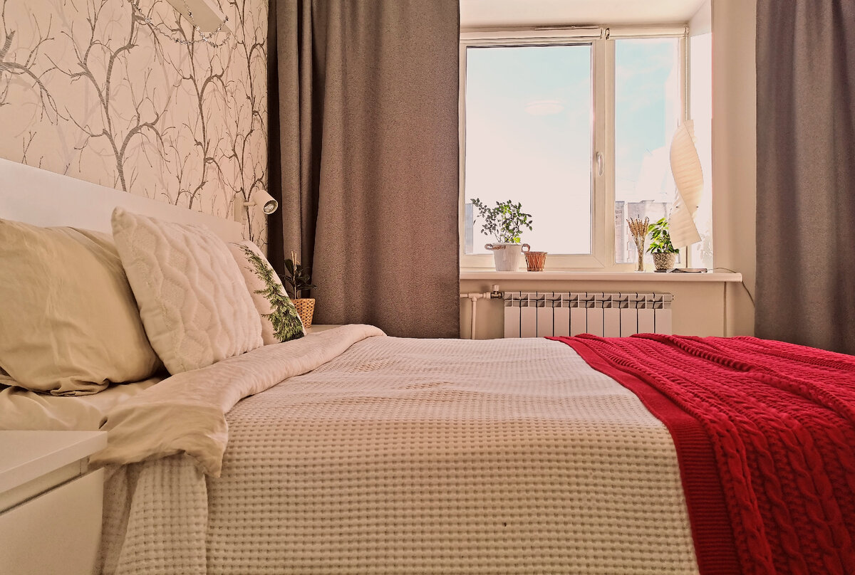 Можем предположить, что у кого-то могли возникнуть вопросы, при чем тут уют и переделки мебели? И собственно хоумстейджинг. Что ж , самое время пояснить и эту часть. Представим, что вы только недавно купили жилье с целью его перепродажи или сдачи в аренду или сами переехали в съемную квартиру. У вас есть определенная база, которая максимально нейтральна, и зачастую, не совсем в вашем вкусе. Есть вариант смириться (уговорив себя, что "это же на время" или "ну так купят"), либо же добавить жизни пространству с помощью разных инструментов. Так вот, профессиональный стейджер может сделать так, что при минимальных затратах это пространство заиграет новыми красками. Чтобы было понятнее, давайте разберем конкретный пример. У нас есть база: спальня, в которой выполнен свежий ремонт. Есть приличная мебель, но все это выглядит…обычно. Можно оставить вот так Это же всего лишь кровать, да и вечером все равно разбирать. Не привлекает внимание, не так ли? Можно сделать вот так Уже лучше, но...