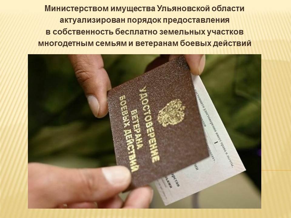 Министерством имущественных отношений и архитектуры Ульяновской области актуализированы состав, последовательность и сроки выполнения административных процедур по предоставлению в собственность бесплатно земельных участков, находящихся в государственной собственности Ульяновской области или государственная собственность на которые не разграничена, гражданам, имеющим трёх и более детей, гражданам, являющимся инвалидами Великой Отечественной войны, или ветеранами боевых действий, или признанным в установленном порядке инвалидами с указанием военной травмы в качестве причины инвалидности, гражданам, являющимся одним из родителей (в том числе одинокой матерью либо одиноким отцом) в студенческой семье, имеющей ребёнка (детей), требования к порядку их выполнения, в том числе особенности выполнения административных процедур в электронной форме, в многофункциональных центрах, досудебный (внесудебный) порядок обжалования решений и действий (бездействия) Министерства, многофункционального центра