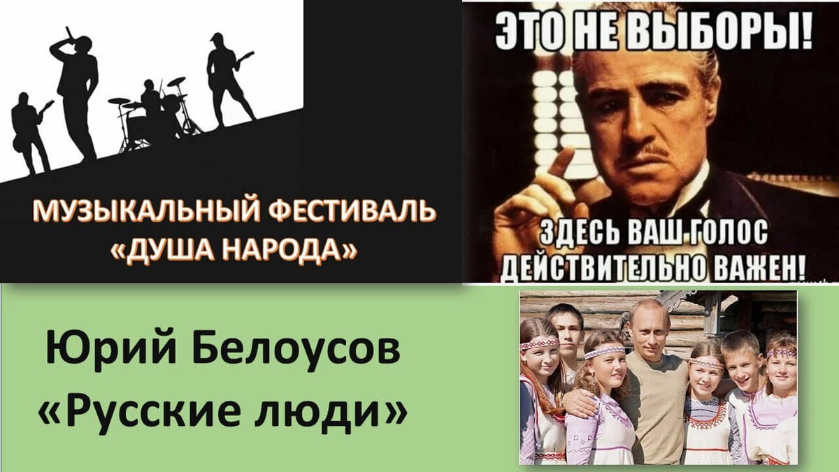 Юрий Белоусов - Русские люди https://t.me/shzsinfo/5577 Фестиваль "Душа народа" совместно со Школой Здравого Смысла анонсируют электронный Музыкальный фестиваль "Душа народа" на приз зрительских симпатий. Голосование производится путём постановки "лайков и дизлайков". Участник (клип), получивший большее количества голосов (в виде лайков) становится победителем Электронного фестиваля "Душа народа" на приз зрительских симпатий Школы Здравого Смысла. По убыванию - занимаются места 2-е и 3-е. Жюри фестиваля - это уважаемые слушатели Школы. А ради кого должна творится и исполняться музыка?! На Ваш суд, дорогие друзья. 7-го мая 2024 года в городе Королёв, Московской области в ЦДК им. Калинина состоится выступление победителей конкурса, где будет вручён Приз зрительских симпатий Школы Здравого Смысла Победителю этой номина