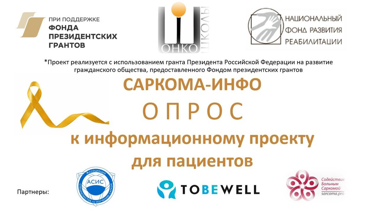 Мы же являемся партнерами опроса: https://forms.yandex.ru/u/65c77d05c417f37089f02834/, который позволит уточнить темы и вопросы к будущим вебинарам, на которые вы хотели бы получить ответы, а также просим подписаться на соцсети Фонда НФР: https://t.me/fondnfr, https://vk.com/1fondnfr, где будет появляться информация об онлайн-мероприятиях проекта «Саркома-инфо».