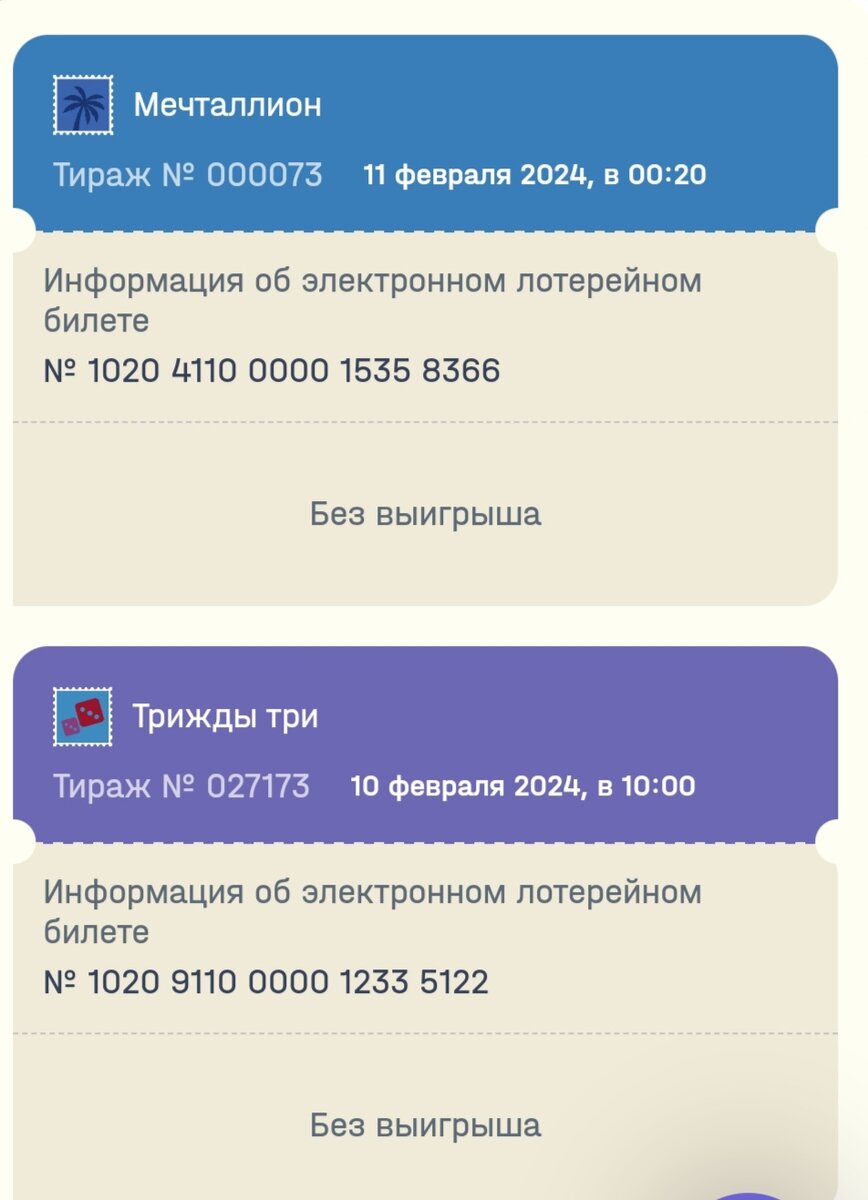 Результат отрицательный, как и на прошлой неделе "zero", в Мечталлион и Трижды три. За несколько месяцев в данной лотерее выиграл всего три раза.