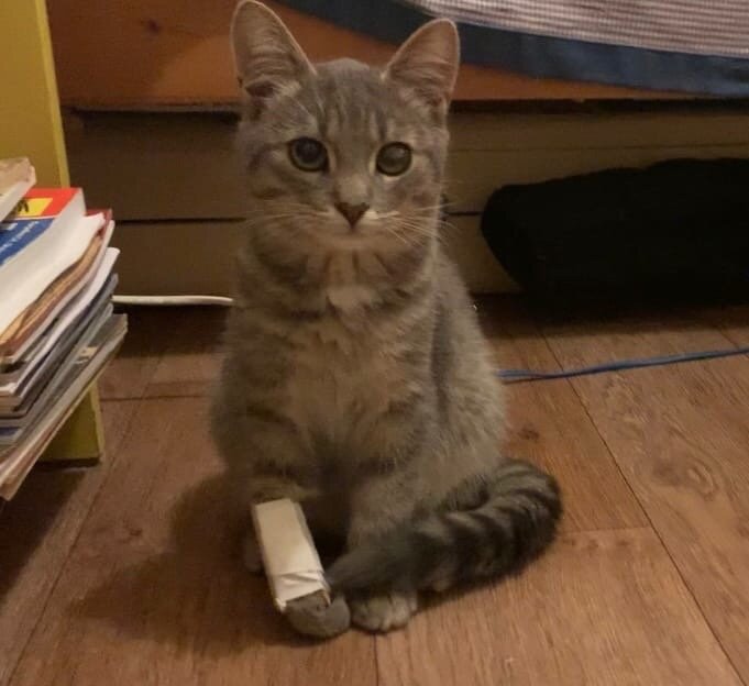 В клинике выяснилось, что все травмы котенка - последствия удара. Либо, его сильно ударил человек; либо - автомобиль (по сути, тоже - человек). И оставил на улице, не оказав никакую помощь. Мальчишку начали лечить. Сначала, у котика был страх перед людьми. Сложно понять, боялся он из-за того, что был в принципе дикий, уличный, или это последствия не слишком приятного общения.