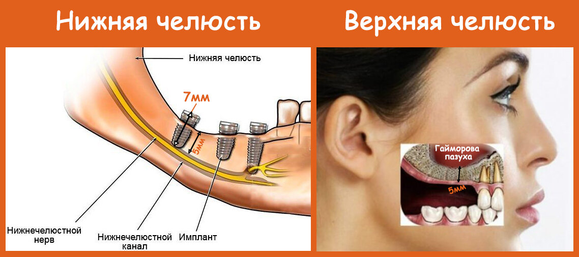 Встречаются случаи когда не хватает буквально 2мм до классической длины имплантатов (от 7 мм до 10мм). И тогда приходится задумываться о синус-лифтинге. Если речь идет о верхней челюсти. Если же не хватает высоты кости на нижней челюсти (до нижнеальвеолярного нерва), то так же рассматривают разные техники подсадки кости. На картинке схематически изображены примерные варианты возможной ситуации. Рассмотрим эти варианты. На нижней челюсти имеется атрофия костной ткани с максимальной высотой 5 мм (рабочая - 6мм). Классические импланты - 7 мм в длину, значительно выступают за пределы высоты кости нижней челюсти. Так оставить нельзя, ввиду высокого риска развития дальнейшего воспаления, которое приведет к еще большой атрофии костной ткани и как следствие "выпадение" имплантата. Поэтому для применения имплантатов в такой клинической ситуации прибегают к костной подсадке. Что значительно увеличивает стоимость имплантации и ,порой, усложняет послеоперационный период. На верхней челюсти так же