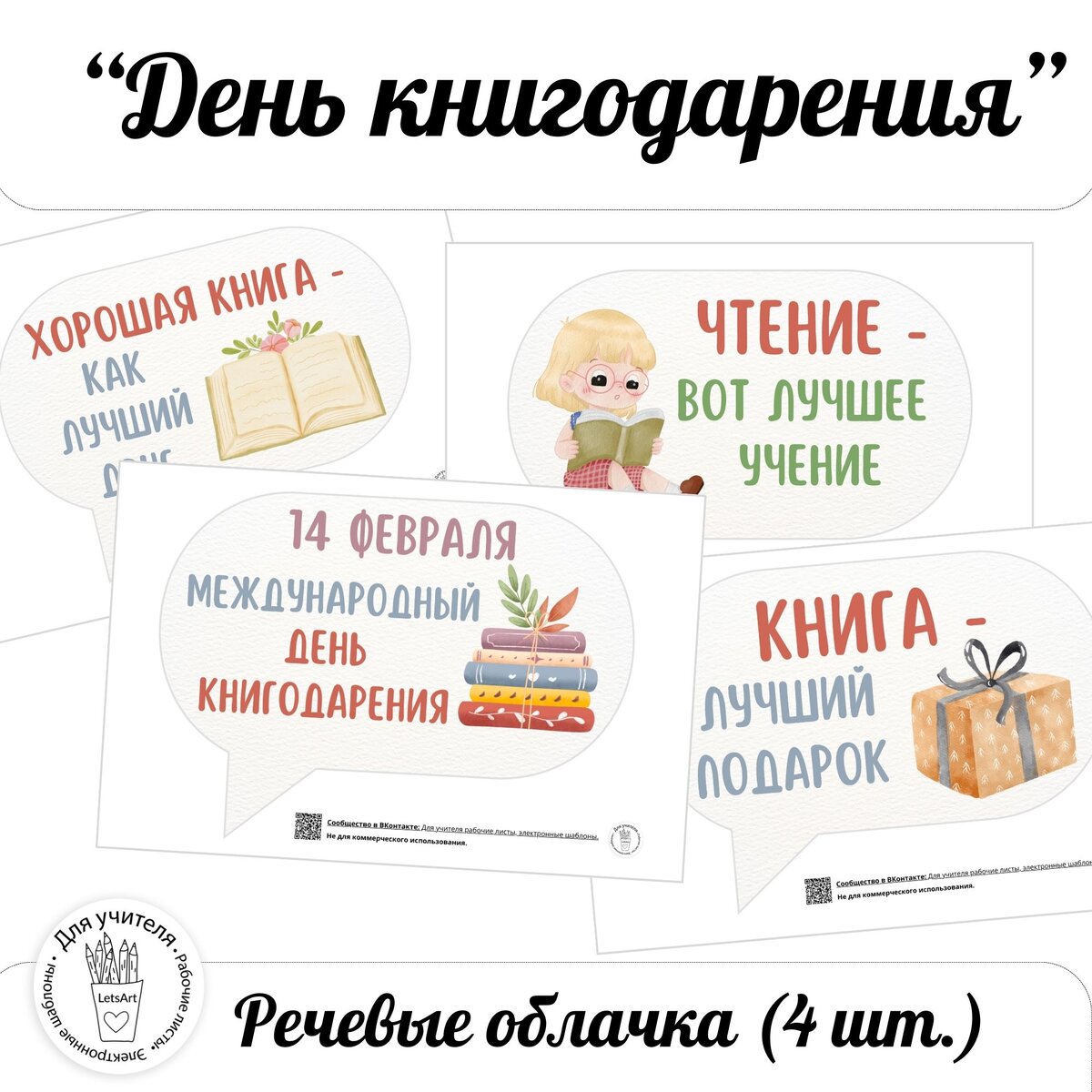 Всемирный день книгодарения отмечается 14 февраля - в этот день можно и книу подарить и поговорить о пользе книг в нашей жизни. Для оформления тематического занятия я приготовила набор речевых облачков - это макет формата А4 который можно распечатать на цветном принтере, вырезать и использовать для оформления школьной доски, создания стикеров или фотобутафории. Скачать 4 речевых облачка бесплатно можно в моем Сообществе ВКонтакте. Полный набор из 11 речевых облачков можно приобрести в магазине Сообщества