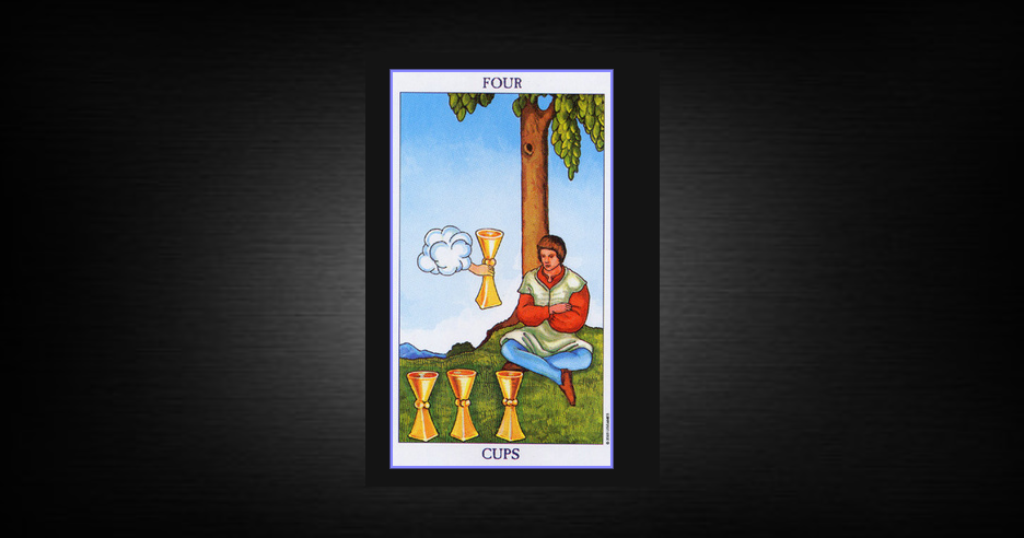 4ка кубков часто выходит на ситуации, когда человек слишком увлечен своими субъективными переживаниями, зациклен на, например, обиде или воспоминаниях, не видит, что ситуация/решение вопроса/возможности/ сами идет к нему в руки. Пока ты в таком состоянии, тебе действительно трудно увидеть возможности и предложения, а это прямой путь в 5ку кубков - там ты плачешь от того, что не смог использовать, не успел, не оценил, не взял то, что само в руки шло.