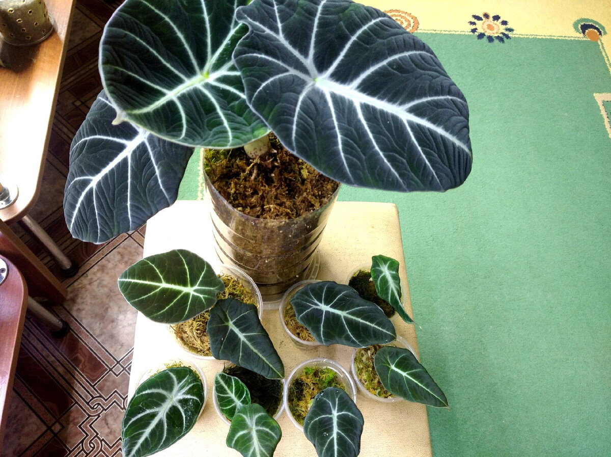 Красота и причудливость листьев этого растения завораживают многих! Практически каждый цветовод хочет иметь её в своей коллекции, однако она бывает капризна также, как и притягательна, если не создать ей идеальные условия. В моей коллекции есть несколько сортов алоказий, которые достойны особого внимания, среди них сорта: Жаклин, Блек Вельвет, Медная (Купрея Ред) , Шкура Дракона (Dragon Scale) , Мело, Скальпрум, Ниндзя, Мишольца (Фрайдек).... Листья этих растений похожи на искусственные, иногда они напоминают панцири доисторических существ, что-то внеземное... Ими невозможно не любоваться, особенно когда на улице зима. Некоторые сорта мне приходилось подолгу искать, чтобы приобрести в коллекцию, ведь редко такое можно встретить в обычных цветочных магазинах. Так как алоказии не являются для меня лёгкими в уходе растениями (состав грунта им нужен особенно рыхлый, и влажность воздуха повышенная), практически все свои экземпляры я выращиваю в живом мхе. Постоянный мониторинг их