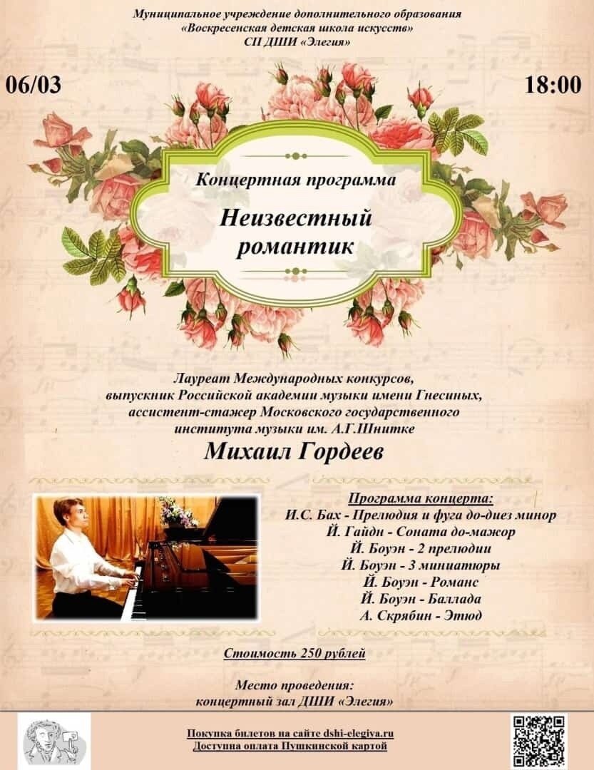 Детская школа искусств «Элегия» приглашает на концертную программу «Неизвестный романтик» лауреата Международных конкурсов, выпускника Российской Академии музыки имени Гнесиных, ассистента-стажера Московского государственного института музыки им. А.Г. Шнитке Михаила Гордеева.