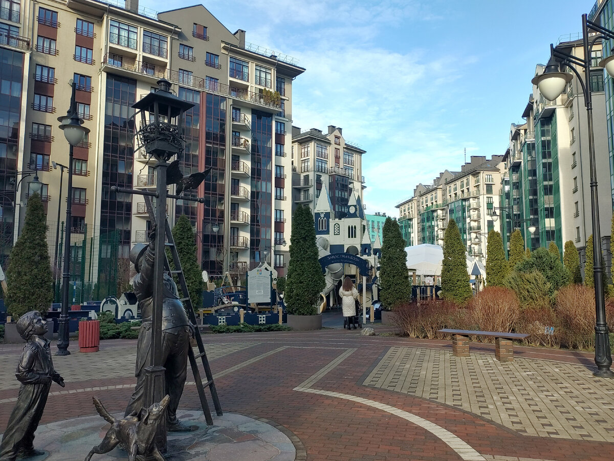 На этот жилой комплекс в Калининграде я уже давно глаз положила. В прошлый наш приезд мы жили напротив и по вечерам дома со шпилями загадочно светились и манили меня. Начитавшись, что в ЖК "Цветной бульвар" внутри красота необыкновенная, один раз я предприняла попытку проникнуть на их территорию, но они намертво огородились забором и ... в- общем, чужие там не ходят. Но не на ту напали, если у меня есть цель я её все равно достигну. В этот наш приезд я просто-напросто сняла квартиру в ЖК "Цветной бульвар" и сейчас мы в нем живём. Расскажу мои впечатления о лучшем девелоперском проекте 2017 года, за который застройщик получил строительного "Оскара". Комплекс состоит из семи многоквартирных домов, объединенных общей дворовой территорией, закрытой от посторонних. Внутри все действительно очень ухожено, безупречные фасады и фонари ручной работы, аккуратные дорожки, обрамленные туями, летом на газонах цветочки радуют глаз. Очень красивые скульптуры фонарщика и фрау Марты. Посредине комплек
