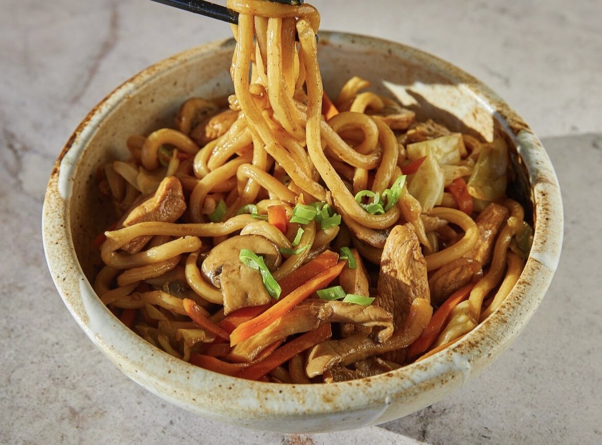 Сложность рецепта: легкий Время приготовления: 25 минут Ингредиенты (на 2 порции): Разрезаем капусту на четвертинки и удаляем сердцевину. Затем нарезаем ее небольшими кусочками. Грибы нарезаем ломтиками. Морковь нарезаем соломкой. Далее очищаем репчатый лук и тонко его нарезаем. После нарезаем куриную грудку полосками. Приступаем к приготовлению соуса. Берем миску, добавляем туда 3.5 столовые ложки соевого соуса, 1 столовую ложку уксуса и 2 чайные ложки сахара. Перемешиваем до получения однородной массы. В миску кладем лапшу удон и заливаем ее кипятком. Замачиваем около 2 минут или пока лапша удон не станет рассыпчатой. Сливаем воду и откладываем миску в сторону. В большой сковороде или воке разогревам масло на среднем огне. Добавляем курицу и обжариваем до слегка золотистого цвета. Добавляем грибы, репчатый лук и обжариваем на средне-сильном огне примерно 3 минуты. Затем добавляем морковь и капусту. Продолжаем обжаривать, помешивая, пока лук не станет прозрачным, а овощи мяг