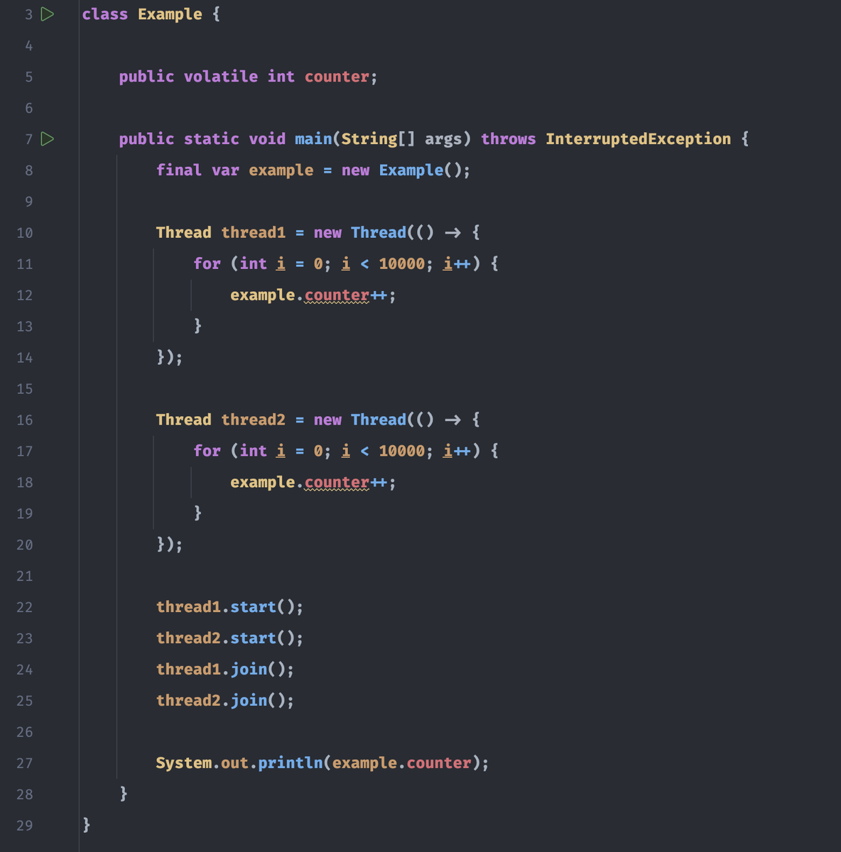 В мире многопоточного программирования в Java существует несколько механизмов для обеспечения безопасности и согласованности данных при работе с несколькими потоками. Один из таких механизмов - это ключевое слово volatile, которое обозначает, что значение переменной может быть изменено несколькими потоками и что изменения должны быть видны всем потокам немедленно. Однако, помимо volatile, в Java также существует понятие атомиков, представленное классами из пакета java.util.concurrent.atomic. В этой статье мы рассмотрим, почему иногда атомики предпочтительнее volatile и когда их использование оправдано. Когда переменная объявлена как volatile, операции чтения и записи этой переменной атомарны (то есть не могут быть прерваны другими потоками). Однако, для операций, которые не являются простыми чтениями или записями, volatile не обеспечивает атомарности. Например, инкрементация volatile переменной counter в приведенном ниже коде не является атомарной, потому что это не только чтение и зап