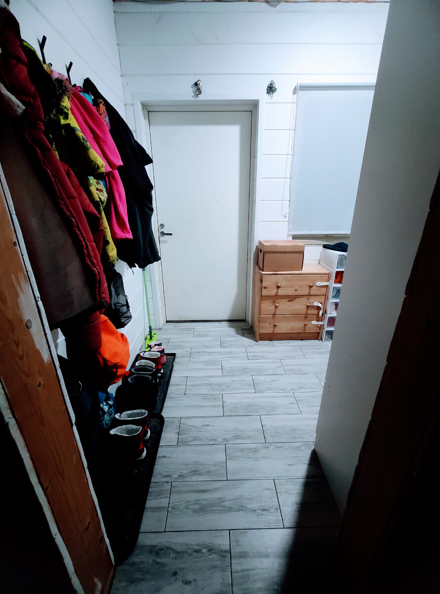 Задача сеней - отгородить коридорную часть от основного дома, отсекая холод и грязь. Наши сени до сих пор выполняют функцию коридора. Ждем установку дверей. А пока мы ее ждем - покажу, что успели сделать за последние полгода. А успели многое: поставили шкафы, органайзеры и установили вешалки. И конечно же тут был не один десяток перестановок, но всю эту историю я покажу как-нибудь в другой раз. Заходим? Перед нами входная дверь. Возможно на ней будет зеркало, в может и нет. Пока точно лишь могу сказать, что ключница появится права от двери. Далее по курсу: лапомойка, собачья амуниция, органайзер для шапок и комод, где хранятся полезные мелочи, шарфы и поясные сумки. Долго искала массивные крючки, которые перекликались бы с ручками шкафов. Все равно не попала — мелковаты. На крючках весит одежда, которая носится «вот прям щас»: Теперь дилемма: довести крючки до двери или повесить у входа небольшое зеркало? В шкафах зимние и осенние варианты верхней одежды. В одном ящике дочкины но