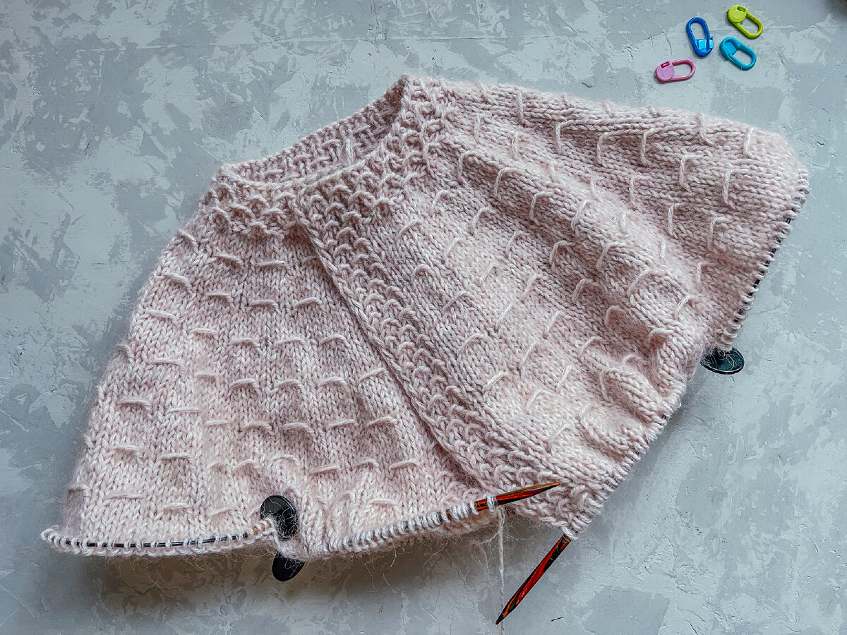 Когда мы вяжем сверху, горловина расчитывается с помощью прибавки на свободу к мерке ОШ (обхват шеи). Минимальное значение, которое я использую - 6см. Но, при такой прибавке нужно предусматривать застежку, ибо через голову эту вещь вы не наденете 💯 Чем больше прибавляете сантиметров к ОШ, тем более длинная получается окружность горловины, соответственно. Важно учитывать, что в начале работы горловина часто кажется совсем маленькой. Но поверьте, после того, как отвяжется всё изделие и оно пройдёт полный цикл ВТО, картина изменится. Во-первых, под собственным весом рукавов и тушки изделия горловина равномерно растянется во все стороны. Во-вторых, после стирки изделие, в большинстве случаев, меняет свои параметры и эластичность. Если у вас есть сомнения, вы всегда можете проверить место своего вопроса с помощью сантиметровой ленты или линейки. Например, касаемо горловины в моем случае, я беру горловину за оба конца (так как изделие у меня с застежкой), выпрямляю её до прямой линии и