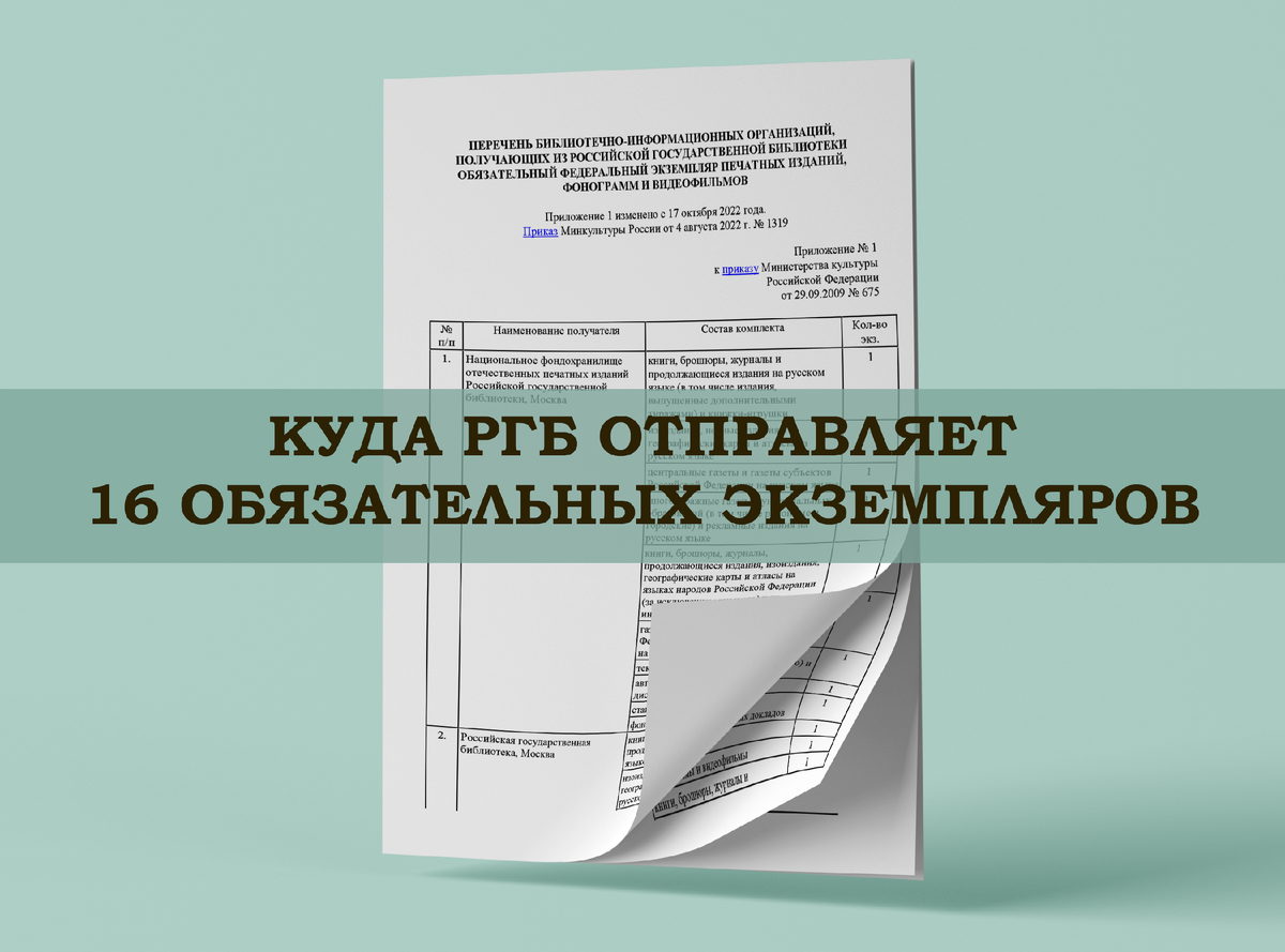 В соответствии со статьей 17 Федерального закона "Об обязательном экземпляре документов" от 29.12.1994 N 77-ФЗ на Российскую государственную библиотеку возлагается обязанность по распределению и доставке обязательных федеральных экземпляров печатных изданий, фонограмм и видеофильмов в библиотечно-информационные организации в соответствии с утверждаемыми уполномоченным Правительством Российской Федерации федеральным органом исполнительной власти перечнем и правилами доставки. Обязательными экземплярами документов являются экземпляры различных видов тиражированных документов и экземпляры печатных изданий в электронной форме, подлежащие безвозмездной передаче производителями в соответствующие организации. Печатные документы, в том числе книги, подлежат передаче в Российскую государственную библиотеку как обязательные экземпляры в течение семи дней со дня выхода в свет первой партии тиража. В частности, передаче подлежат 16 обязательных экземпляров книг и брошюр, журналов и продолжающихся