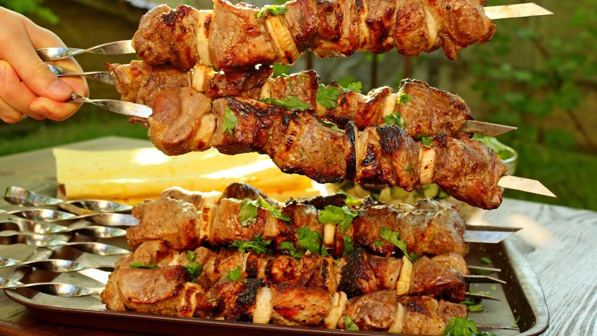 - Подавайте шашлык горячим с свежими овощами, зеленью, соусом на ваш вкус.
