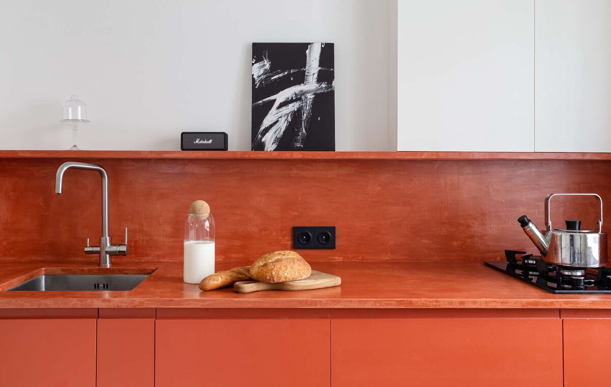 На фартуке, столешнице и полочке на кухне использовался микроцемент терракотового цвета.