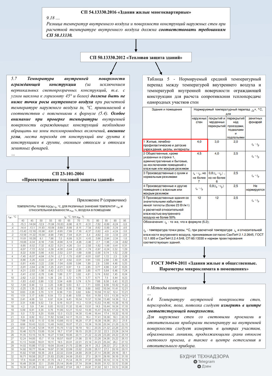 Зима это период жалоб на промерзания стен. Сделал коллегам шпаргалку по температуре внутренних поверхностей ограждающих конструкций. Подписывайтесь на мой телеграм канал, там найдете больше статей и интересной информации. Свои вопросы, пожелания, замечания, фотографии нарушений, предложения по темам статей можете отправлять на почту budnitekhnadzora@yandex.ru.