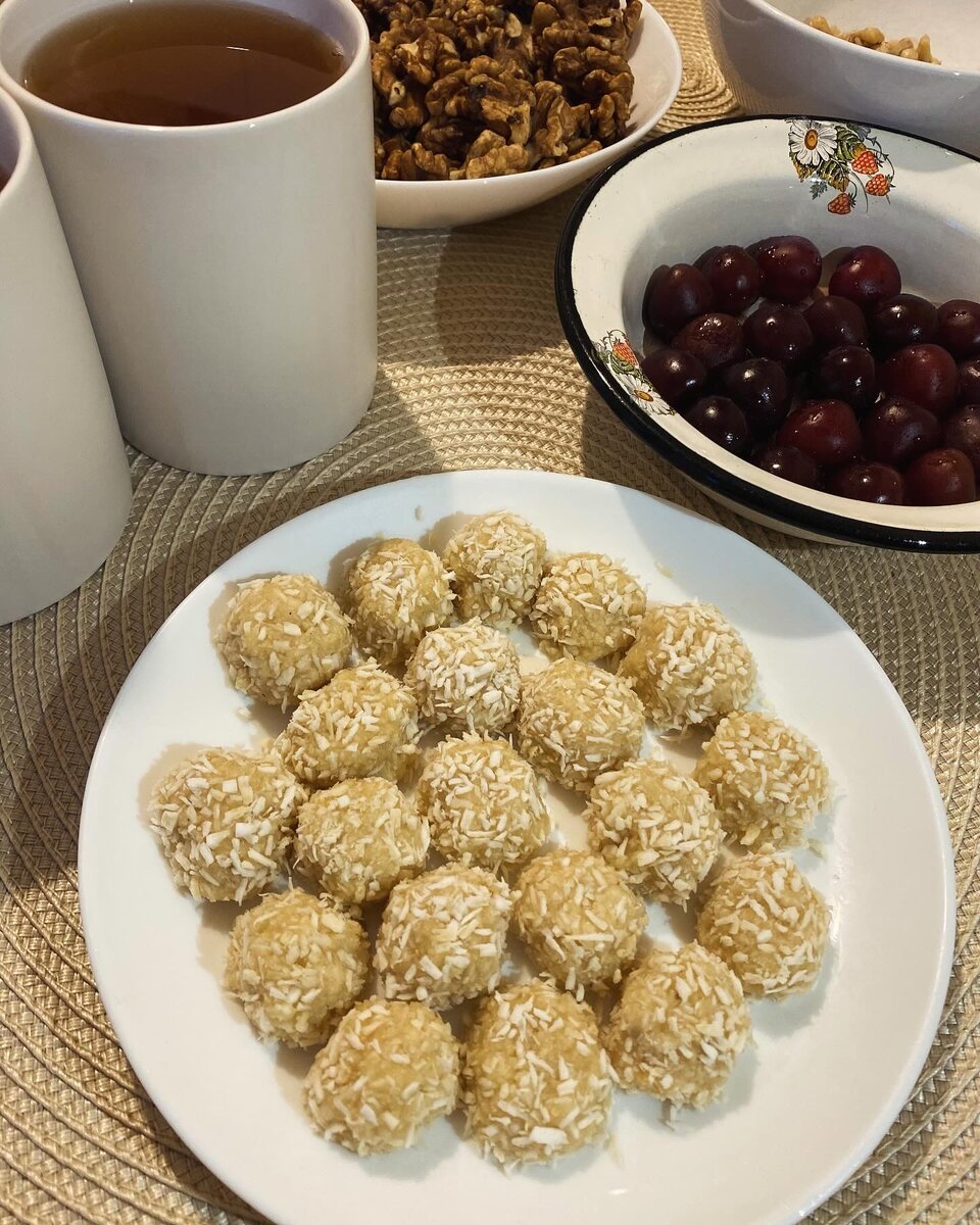 6 февраля Полезные свойства Кешью употребляются при дистрофии, анемии, псориазе, нарушениях обменных процессов. Орехи богаты углеводами и белками, железом, цинком, фосфором, кальцием, а также витаминами В1, В2, А. Кокосовая стружка способна выводить шлаки из организма, она содержит клетчатку, полезные жиры, марганец, фосфор, кальций, калий, цинк, натрий, медь, железо, витамины А, В, Е, С. Ингредиенты Кешью – 300 г. Кокосовая стружка – 300 г. Масло ГХИ – 3 ст.л./сливочное масло – 6 ст.л. Мёд – 3 ст. л. Приготовление Кешью либо хорошо промываем, либо вымачиваем 1 час, в зависимости от отношения к фитиновой кислоте, которую они содержат, и подсушиваем в духовке. Подготовленные орехи и кокосовую стружку измельчаем в кофемолке/блендером до однородной консистенции (они дадут масла и будут вязкими). Смешиваем масло, мёд, подготовленные орехи и кокосовую стружку. Из полученной пластичной массы формируем шарики, обваливаем их в кокосовой стружке, убираем в морозилку на пару часов. Приятного