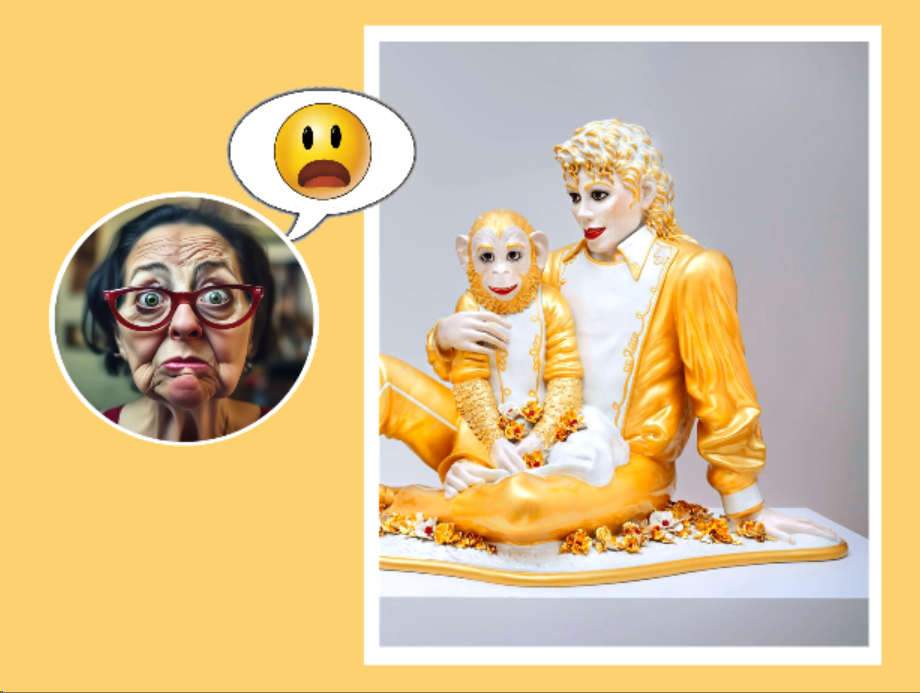 Из ныне живущих скульпторов самым дорогим считается Джефф Кунис. Его работы продаются за совершенно неадекватные деньги. И при этом скульптуры отвратительны, как по идее, так и по исполнению. И это признает сам автор, ведь он не зря свои работы называет "Банальность", "Дешевка", "Псевдоискусство". Вот, к примеру, метровая скульптура золотого Майкла Джексона с обезьянкой. Она, как раз входит в серию, которую скульптор дал честное название - "Банальность". Эта скульптура пару лет назад была продана за 5 миллионов долларов. Я впечатлена - не работой, а тем, что за нее отдали такие деньги. Выглядит скульптура максимально дешево - китчевая золотая краска, несуразное лицо у Майкла. Есть еще и другие особенности, которые еще больше делают эту работу "банальной": В чем же тогда секрет успеха этого скульптора? Наверное, покупателей-миллионеров он берет своим бессовестной наглостью. его столько раз обвиняли в халтуре, но каждый раз художник выкручивался и выставлял себя гением. Например: Покажу