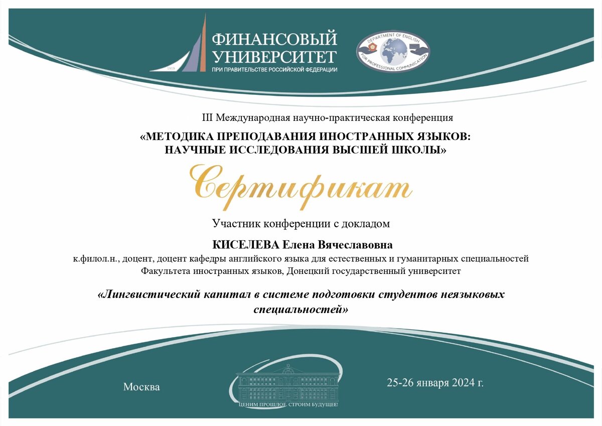 Доцент кафедры английского языка для естественных и гуманитарных специальностей Елена Киселёва приняла участие в III Международной научно-практической конференции «Методика преподавания иностранных языков: научные исследования высшей школы», которая проходила в Москве 25-26 января 2024 года, и выступила с докладом «Лингвистический капитал в системе подготовки студентов неязыковых специальностей». Организатором мероприятия выступил Финансовый университет при Правительстве Российской Федерации.