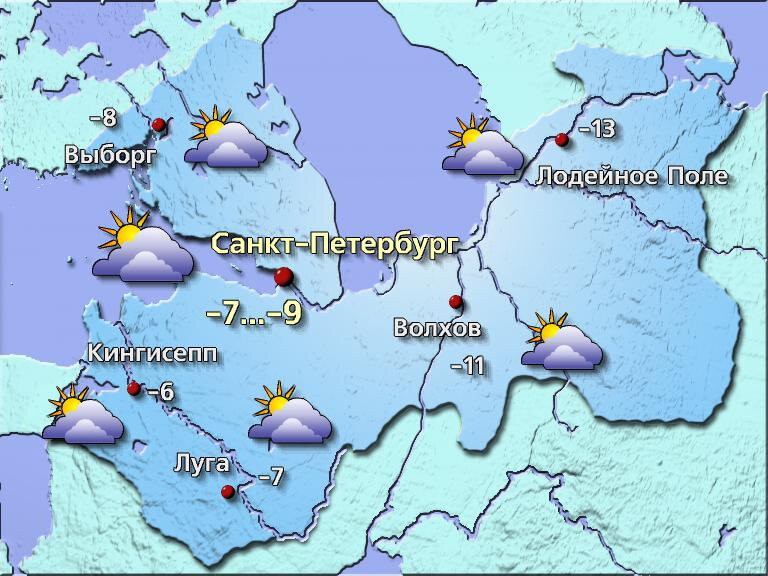 Температура в Петербурге на 4–5 градусов ниже нормы В Петербурге сегодня будет холодно, солнечно и довольно ветрено. По прогнозу ФГБУ «Северо-Западное управление по гидрометеорологии и мониторингу окружающей среды», 13 февраля в городе переменная облачность, без осадков. Ветер северо-восточный, восточный, умеренный. Температура воздуха в 8 часов утра составила минус 14 градусов, днем она повысится до минус 7–9. На дорогах гололедица. Синоптическую ситуацию в регионе формирует гребень скандинавского антициклона. Облаков в небе будет немного и обойдётся без осадков, а температурные показатели окажутся на 4–5 градусов ниже климатической нормы. Атмосферное давление будет слабо расти и составит 768 мм рт. ст., что выше нормы, сообщает ведущий специалист центра «ФОБОС» Михаил Леус. В ближайшие два дня сохранится примерно такая же погода, но к 15 февраля небо закроют облака.