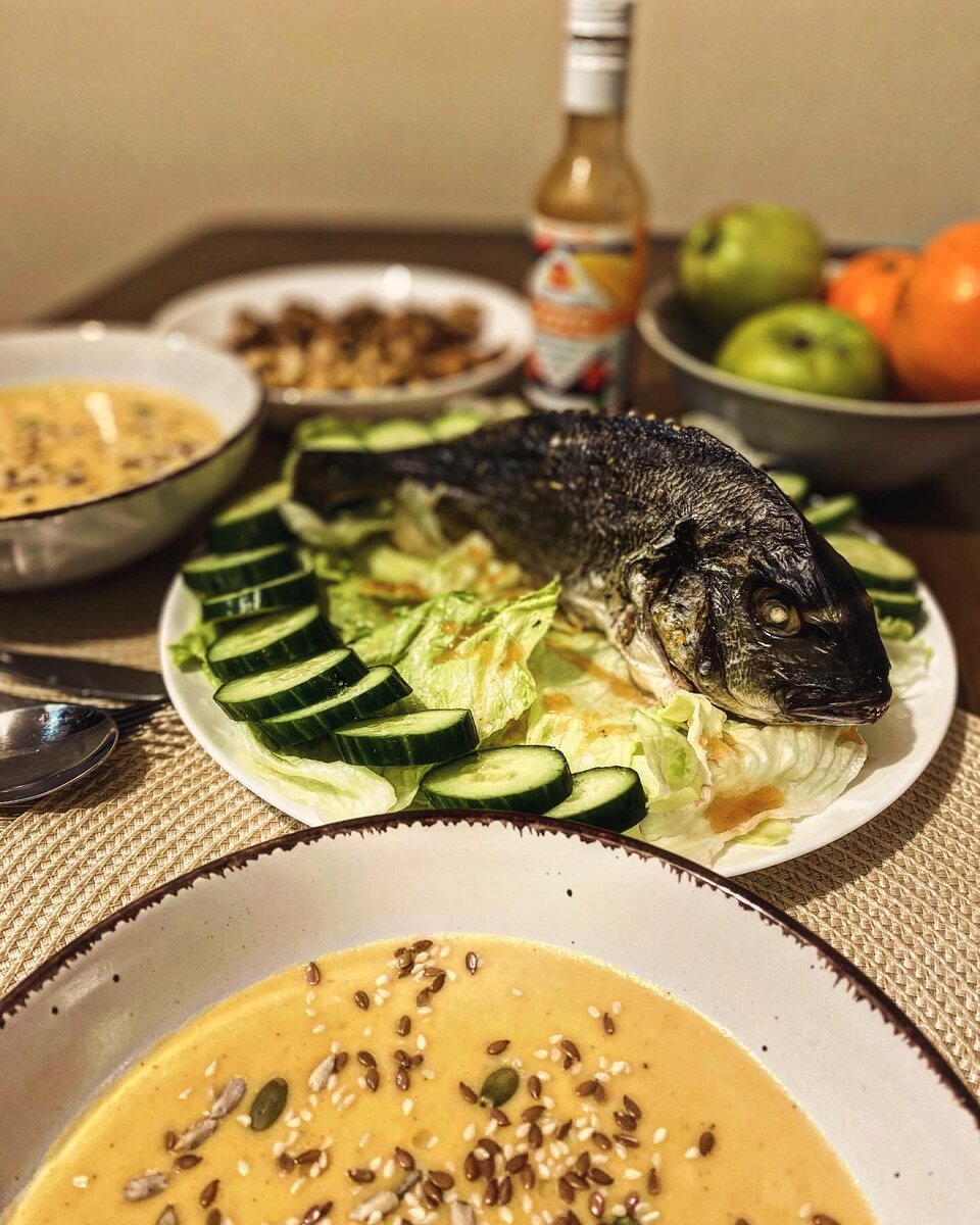 Полезные свойства Золотистый спар/аурата/дорада благотворно влияет на организм, участвуя в обменных и гормональных процессах. Мясо рыбы содержит фосфор, калий, йод, марганец и цинк. Варёный горох регулирует гемоглобин и уровень жидкости в организме, ускоряя обмен веществ. Салат айсберг богат фолиевой кислотой, фосфором, калием, натрием, магнием, кальцием, медью, витаминами С, К, А, группами В, холином. Клетчатка и пищевые волокна салата – незаменимые помощники для отличного пищеварения. Ингредиенты Золотистый спар, или аурата, или дорада – 1 шт. Горох дроблённый – 800 г. Красный лук – 1 шт. Салат айсберг – ½ кочана. Масло ГХИ – 8 ст. л. Сода – 2 ст. л. Соль – по вкусу. Любимые приправы – по вкусу. Свежие овощи – для подачи. Семена – для подачи. Соус манго-чили - по желанию. Приготовление Горох замачиваем в кастрюле на ночь. Воду сливаем, горох промываем несколько раз. Заливаем горох фильтрованной водой так, чтобы она покрывала его на 2 см. Ставим на огонь и доводим до кипения, сн