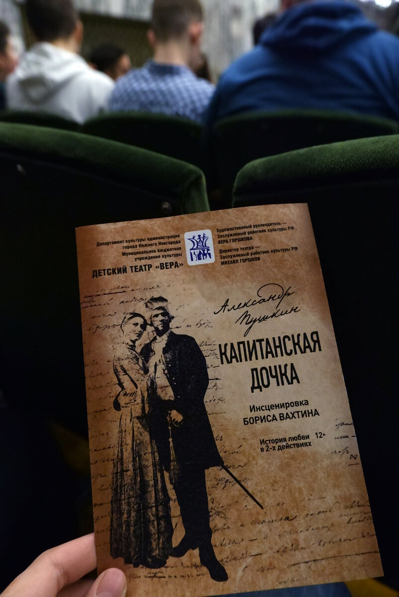 Недавно команда «Юнкор» (Дворец творчества детей и молодежи на Миусах) побывала в ДК имени Зуева на постановке «Капитанская дочка» по любимому Александру Сергеевичу Пушкину. Этот спектакль участвует в Фестивале «Школьная классика». Начиная с 2014-го, каждый год в разных театрах организаторы выбирают постановки по литературным произведениям школьной программы, и приглашают на них детей и подростков Дом Культуры (ДК) имени Зуева выглядит довольно необычно. Подъем в основной зал ведет мраморная винтовая лестница, и пока ты идешь, можно смотреть на улицу, потому что весь второй этаж от пола до потолка занимают окна. Зрительный зал очень большой, в нем огромный партер, но один балкон, расположенный выше обычного, что удивляет с первого взгляда (ведь мы привыкли видеть балкончики по обе стороны, а тут этого не наблюдаем). Стены зала тоже отделаны мрамором. Нам показался этот храм искусства уютным, наверно, еще и потому, что все очень винтажное… Кстати, и программка к постановке «Капитанская