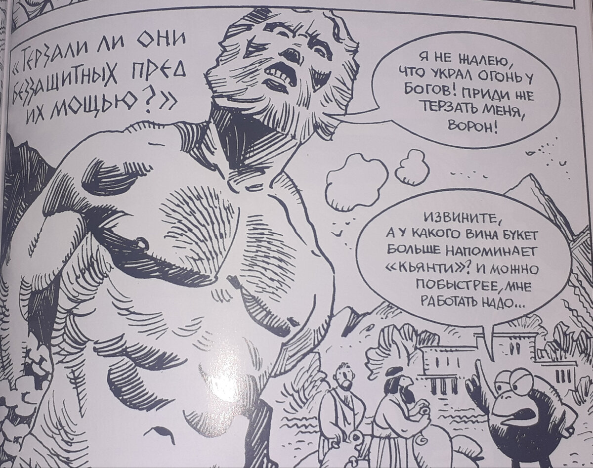 В этом году я получил комикс по Мультивселенной Смешариков и прочитал его. В нем есть история про конспирологов, которые называют смешариков сильными мира сего, свергавшими царей и строившими империи. В общем, смешариков показали богами. Это показывается на примере древнегреческих мифов. Так, мы можем увидеть Прометея, укравшего огонь у богов. За это его приковали к скале, к нему прилетал орёл и выклевывал его печень, которая вырастала и восстанавливалась вновь и вновь. В версии мифа от смешариконспирологов орёл был заменён на ворона Кар-Карыча Бараш редактирует поэму Аполлония Родосского "Аргонавтика". Он заменяет золотую шкуру козла на золотую шкуру барана, называемую золотым руном. Именно за золотым руном - золотой шкурой барана - отправились главные герои "Аргонавтики". Насколько я понял миф, то золотое руно было создано где-то на Кавказе. Там шкуры баранов окунали в реки, которые были золотыми. Из рек золото прицеплялось к шкурам баранов, в результате получалось золотое руно "Да