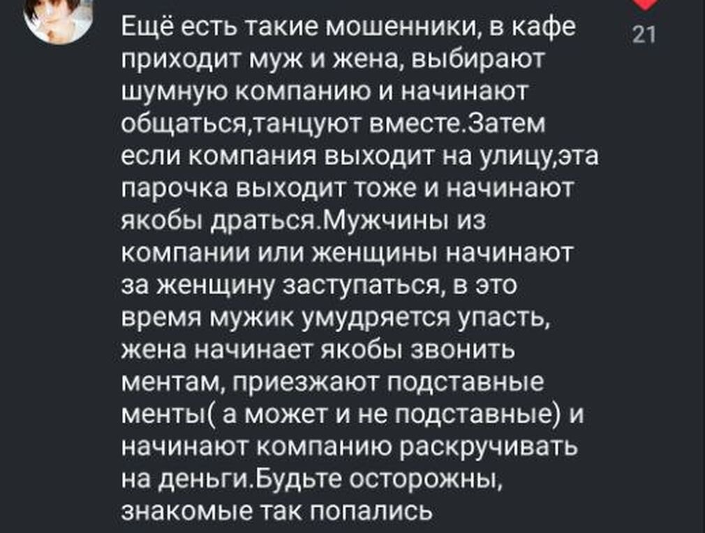 В нашем братском и почти соседнем Кыргызстане набирает обороты новый развод. Внимание на коммент на скрине. И да, тема зашла не просто так. Изначально пост был про другой развод. Ситуация, значит, следующая. Крупный, спортивного телосложения мужчина буквально «сдает в аренду» свою жену (без интима, конечно, как я понимаю). Женщина регистрируется на СЗ, представляется незамужней и вовсю ходит на свидания. И да, на ней действительно не написано, в браке она или нет. Достаточно снять кольцо. В маленьких городках еще ладно, но в мегаполисах, где сосед соседа в лицо не знает, подобное может пройти на ура. Так вот, дальше. Как вы уже можете, наверное, догадаться, в самый разгар романтической встречи в кафе / ресторан врывается разгневанный муж ММАшник, угрожающий физической расправой кавалеру, попавшему в ловко раскинутые сети. После 5-10 минут застращиваний «герой» внезапно успокаивается (люди же кругом, да и жена умоляет простить ее не устраивать скандала) и предлагает решить проблему «м