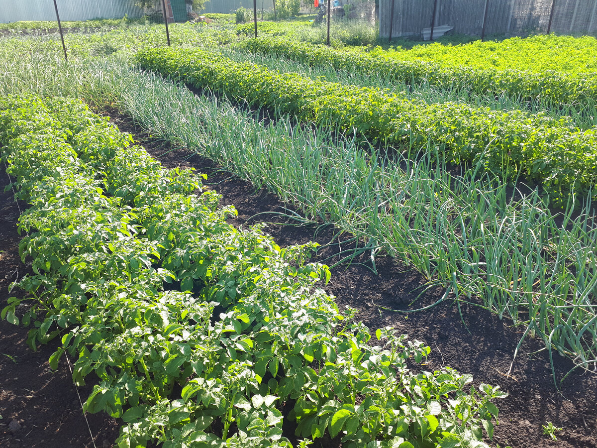 СНАЧАЛА ИСТОРИЯ. ОПЫТ - СЫН ОШИБОК ТРУДНЫХ Когда мы начали осваивать участок в деревне муж выделил мне пустующую землю за старыми хозпостройками. Сомнений не было - здесь будет огород! Тогда я была совсем зеленым новичком, и ничего лучше мне не пришло на ум, чем посадить картошку и лук. Ну и конечно же хорошо знакомым мне из деревенского детства способом: сплошная перекопка, отсутствие широких проходов между посадками овощей. Уход за огородом не приносил никакой радости: было неудобно полоть и поливать, земля уплотнилась от постоянного хождения прямо по грядкам, ее приходилось постоянно рыхлить. Внесение разрыхлителей, компоста и удобрений на всю площадь участка било по кошельку. Нужно что с этим делать, - подумала я, - и начала изучать "огородное дело". ПЕРВЫЕ ГРЯДКИ Уже на следующий сезон я могла похвастаться такими стационарными грядками: Ровные рядочки с широкими проходами радовали глаз, да и ухаживать за ними стало легче - перекапывать проходы теперь не было необходимости.