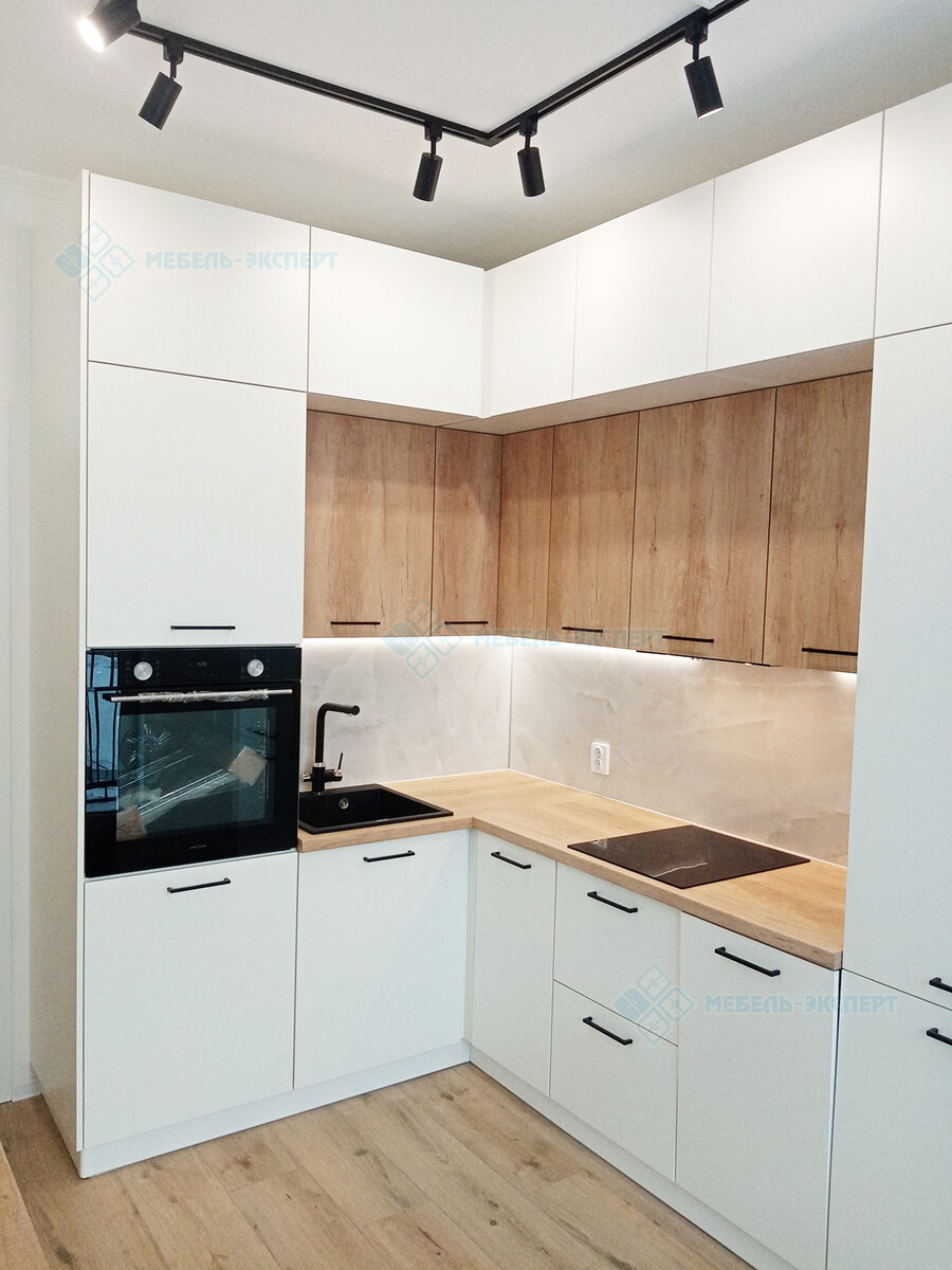 ✅ НАШ ПРОЕКТ - небольшая кухня в современном стиле и в актуальном дизайне. Кухня на заказ за 20 дней Вариант мебели для кухни выполнен с фасадами EGGER. Столешница EGGER - влагостойкая, с еврозапилом, высокого качества. Механизмы для фасадов от лидера мирового рынка BОYARD. Функциональные и вместительные системы хранения. Зональная подсветка.