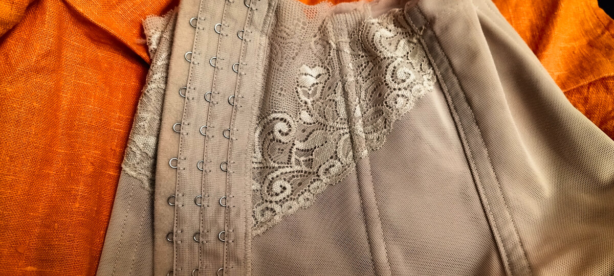 В "Смешных ценах" эта штука сейчас стоит 400 рублей. Это мягкое бельё, напоминающее грации и тому подобное, что было в ходу до 1970х-1980х годов, наверно. Основа из мягкой эластичной ткани в два слоя. Конечно, этот подгрудный пояс-корсет совсем не ретро в исходном виде, - если его застёгивать по всей длине, то форма прямая, - нам это не нужно. Утяжка живота не нужна от слова "совсем". Но можно кое-что сделать, чтобы он больше выделил талию. (Талия в нём на 2 см меньше, чем без него. Удобный.) На фото три крючка вылезают - потом что эти три крючка я застёгиваю на талию (изделие не ношу пока, а только примеряю дома). Не застёгиваю наверху и внизу. Резинки внизу и наверху очень плотные, мне малы и некомфортны - решила их убрать. И стало лучше. Когда только купила, я заменили несколько быстро кривеющих косточек на тонкие хомуты для стяжки. Эти хомуты так не кривятся и не теряют форму, как пластиковые косточки, которых в изделии немного. Косточки заменяла кое-где,