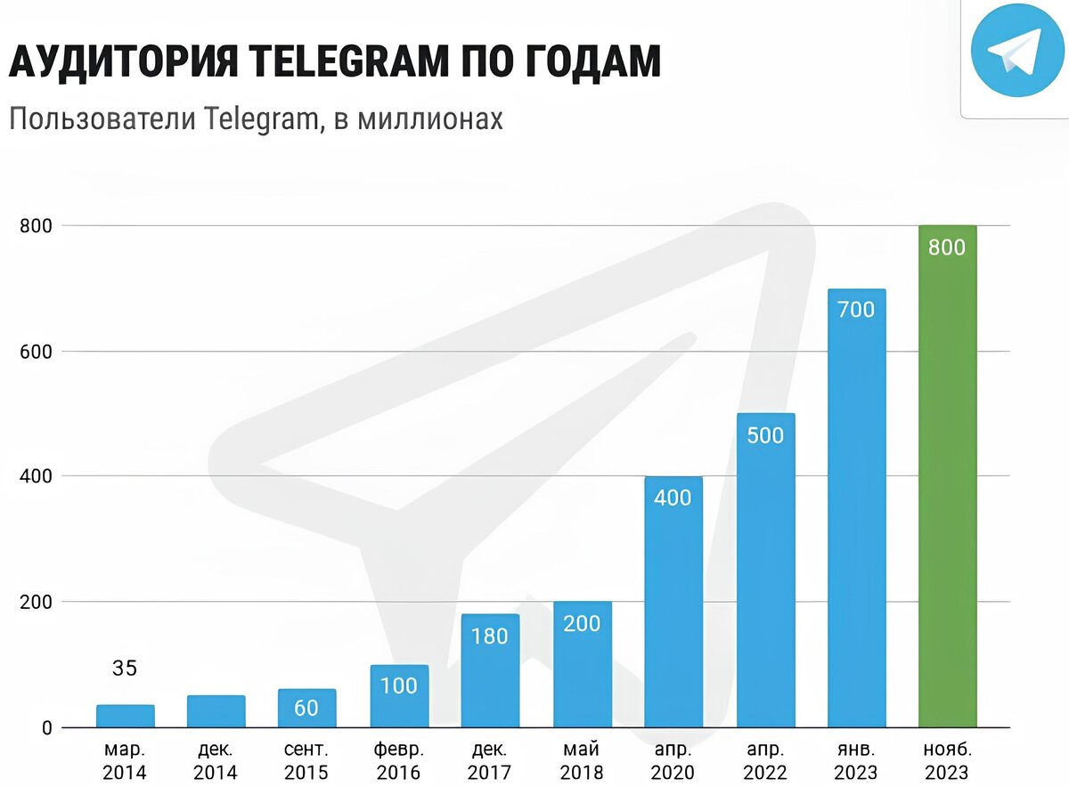 Лучшее время для начала работы в Телеграм — год назад. Второй шанс — прямо сейчас. Я уверен, что этот год будет более прибыльным для тех, кто уже вошёл на рекламный рынок. Главное— не тянуть со стартом и потом не ловить синдром упущенной выгоды. Где ещё сейчас можно найти бизнес с "порогом входа" от 100 тысяч, который окупится в течение 3-6 месяцев? Даже один небольшой канал может приносить очень хорошие доходы, а в будущем перерасти в пассивный доход. На что можно ориентироваться? Аудитория Telegram продолжает расти, мессенджер активно развивается. Это позволяет сделать вывод, что текущие тенденции положительны, рекламный рынок также расширяется. В своем Telegram-канале Павел Дуров (создатель мессенджера) рассказал, что в соцсеть ежедневно приходит около 2,5 миллионов пользователей. При этом в 2023 году общее количество активных пользователей превысило 800 миллионов человек в месяц. Выводы можете сделать сами. Думаю, теперь вам не нужен именно мой ответ на вопрос из заголовка — с ним