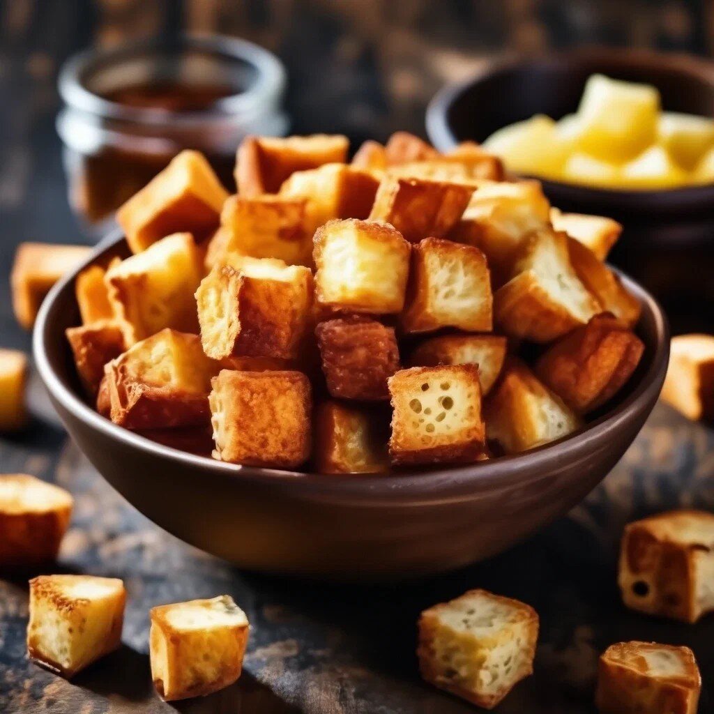 Крутоны - это маленькие сухарики, которые обычно используются в качестве закуски к различным блюдам. Они могут быть приготовлены из различных видов хлеба, таких как белый, черный или ржаной. Крутоны могут быть посыпаны различными специями, такими как чеснок, перец или травы, чтобы придать им более насыщенный вкус. Они также могут быть использованы для украшения блюд, например, салатов или супов. Крутоны являются популярным ингредиентом во многих кухнях по всему миру. Ингредиенты: - 250 г белого хлеба - 1 яйцо - 50 мл молока - соль по вкусу - растительное масло для жарки Инструкции: 1. Нарежьте белый хлеб на кубики размером около 0,5 см. 2. В миске смешайте яйцо, молоко и соль до получения однородной массы. 3. Положите кубики хлеба в миску с яично-молочной смесью и перемешайте, чтобы каждый кубик был покрыт смесью. 4. Разогрейте сковороду на среднем огне и добавьте растительное масло. 5. Выложите кубики хлеба на сковороду и жарьте их до золотистого цвета, примерно 2-3 мин