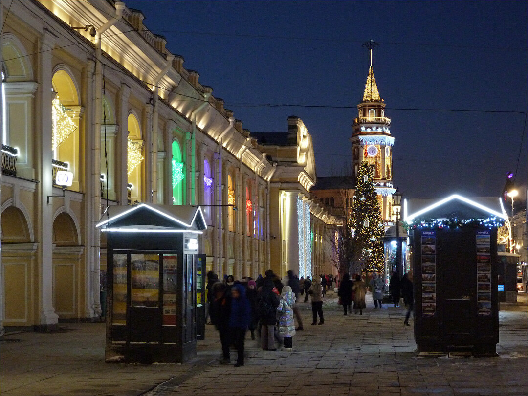 После целого дня, проведённого в музеях — с утра мы побывали на большой выставке Василия Сурикова, а потом бродили по Михайловскому замку — мы решили, что нам необходимо подышать, хоть и морозным, но свежим воздухом. Ну не спать же идти в конце концов, когда вокруг праздник! И мы вновь отправились в странствие по улицам и площадям, украшенным звёздами и огнями Рождественских иллюминаций... Сверкающая Манежная площадь, не взирая на холод, была полна гуляющим людом, и мы имели удовольствие видеть, как нарядная, цветастая двухэтажная карусель принялась кружить заполнивших её кресла желающих. Искренне подивившись энтузиазму народа — почти минус тридцать! — мы полюбовались диковинным зрелищем. Гвозди бы делать из этих людей! А у нас самих меж тем начинали ощутимо замерзать конечности! И мы потопали дальше. Вышли с Манежной площади, и по Малой Садовой, вновь любуясь роскошным покрывалом иллюминации и обозревая содержимое сувенирных прилавков, двигались в сторону сиявшего огнями электрическог