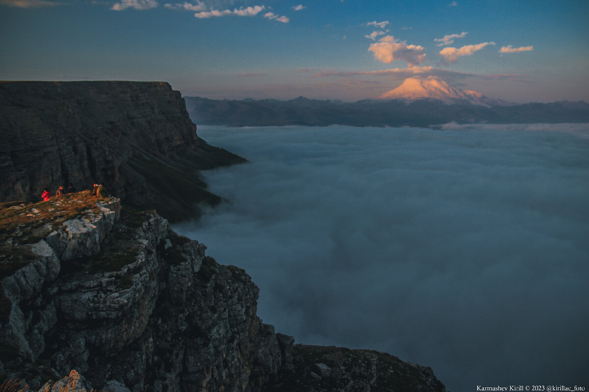 Рассветы на плато Канжол невероятны: белая шапка Эльбруса отсвечивает оранжево-розоватыми оттенками.