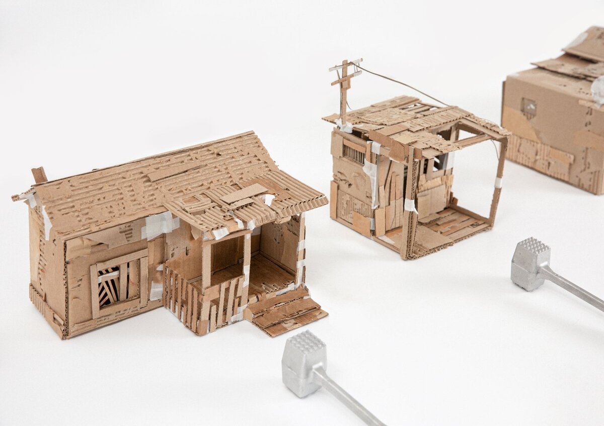 Автор оставляет за зрителями выбор, приглашая их стать активными участниками перфоманса — разрушить инсталляцию с помощью отбивных молотков или сохранить дома в своем первоначальном виде.