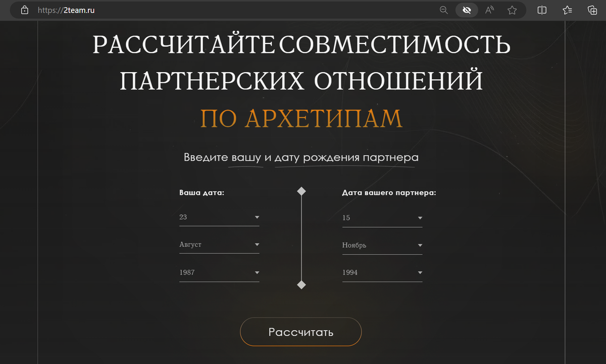 Меня зовут Айгуль . Я консультант по отношениям на основе совместимости Архетипов. Отношения - это одна из самых важных и волнующих сфер жизни каждого человека. Они могут быть источником поддержки и развития, а также вызывать разочарования. Я уверена, что каждая пара имеет свои сильные и слабые стороны. А исследование совместимости по Архетипам поможет вам понять, какие аспекты вашей пары нуждаются в развитии и укреплении, чтобы вы могли вместе радоваться успехам, преодолевать трудности, расти и развиваться. На моем сайте 2team.ru вы можете рассчитать карту совместимости по Архетипам и заказать ПИСЬМЕННУЮ РАСШИФРОВКУ, которая придет на указанную электронную почту в течение 5 минут. Интерпретацию Архетипов на 12 позициях карты совместимости: ОСНОВНЫЕ ПОЗИЦИИ СОВМЕСТИМОСТИ Позиция 1. Архетип на первой позиции определяет, как происходит формирование взаимодействия и первого впечатления о партнере. Позиция 2. Архетип, находящийся на Позиции 2, определяет Сюжет развития отношений и объяс