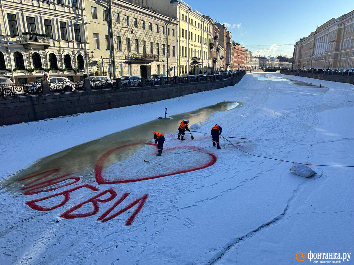Петербуржцев просят не рисовать на льду. Реки в городе второй день чистят от надписей Несколько дней на льду рек в центре Петербурга появляются надписи, а сотрудники экологических ведомств ездят их убирать. В комитете по природопользованию призвали горожан бережнее относиться к водным объектам. Роспись льда водоемов попадает сразу под два административных штрафа: за выход на лёд и за загрязнение водного объекта по ст. 8.13, ч. 5, КоАП РФ, рассказали «Фонтанке» в пресс-службе комитета 13 февраля. За первое нарушение грозит штраф от 1 тысячи до 5 тысяч рублей, а за второе, кроме него, придется выплачивать еще и компенсацию за ущерб окружающей среде и работу задействованных служб. «Кроме того, при поступлении информации о загрязнении ледовой поверхности химическими веществами неизвестного происхождения на место незамедлительно направляется бригада для уборки. Сотрудники вынуждены прерывать плановую уборку водотоков и зачастую направляться в другую часть города», — отметили в ведомстве. Ка