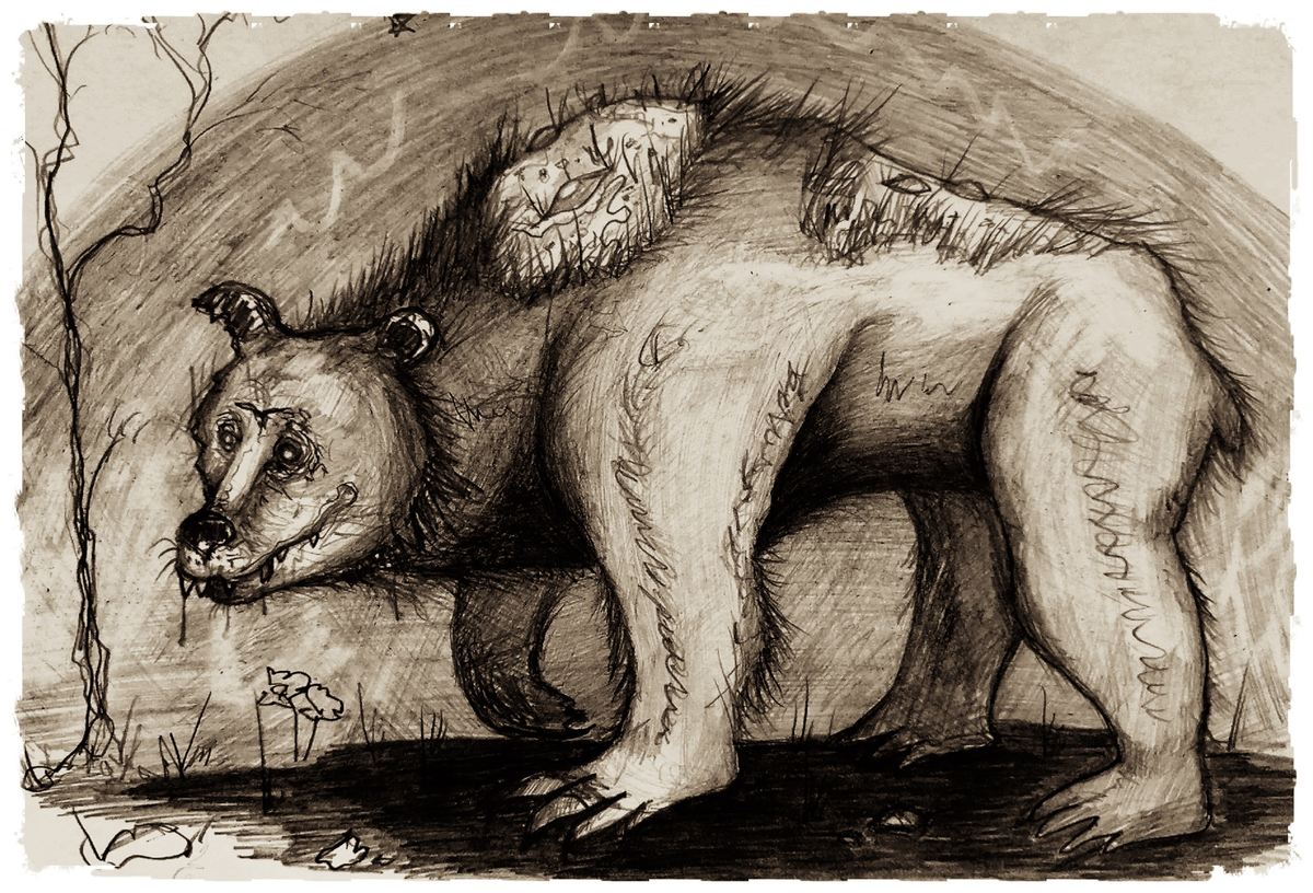 Рассказ охотника из лагеря "тёмных": Про "курицу" и медведя. "Я на "курицу" охотился. Такая бандура железная, ростом с полметра, издалека здорово на лысую курицу смахивает, таких много в лесу осталось, с тех самых времен. Ну вы знаете. Курицы, мины, турели передвижные, автоматические и всякая такая нечисть. Если повезет, и поймаешь такую курицу до того, как она тебя засечет - считай, бесплатная турель для твоего лагеря готова, только успевай заряжать. Там пошаманить надо будет, само собой, но это уже не моя забота - я ловец, а не механик-программарь. Они пустые уже бегают, расстреляли все куда попало, хотя попадаются и полные. Тут уж как повезет.