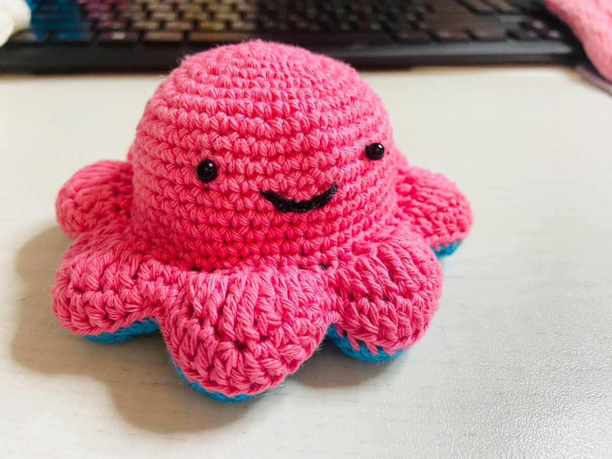 Давно уже хотела связать крючком такого осьминожку. В планах было связать такого осьминога с разными эмоциями из плюшевой пряжи, но перед этим стоило сделать образец из простой хлопковой пряжи, чтобы проверить схему, которую нашла в Интернете. На этот раз снова пришлось схему подогнать под свое удобство вязания. В итоге получилось уже нечто свое, с дополнениями и изменениями. И уже по тому описанию можно будет связать такого же осьминога из плюшевой пряжи, чтобы не распускать неудавшийся элемент будущего осьминога перевертыша.