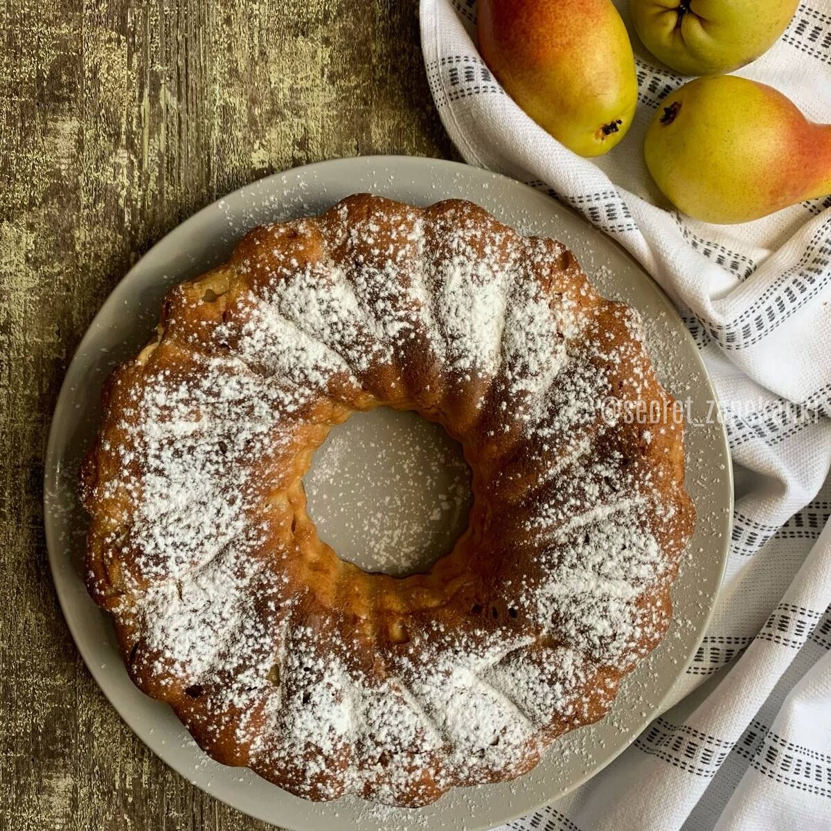 Чамбелла – разновидность итальянской выпечки круглой формы в виде «бублика». Подробно я рассказывала о ней, когда мы пекли чамбеллу с ветчиной и вялеными помидорами. Теперь настала очередь сладкой чамбеллы. Вариантов сладкой чамбеллы существует столько, что я даже не возьмусь считать. Все они разные, особенные, со своей энергетикой и стилем, но все одинаково вкусные и простые в приготовлении. В Италии её обычно подают по утрам за завтраком с кофе. Но на мой взгляд она идеальна и для дневного чаепития. Пора начинать: ⁃ яйцо 4 шт. ⁃ сахар 100-120 г ⁃ соль 1 щепотка ⁃ рикотта 200 г ⁃ масло растительное 50 мл ⁃ мука 250 г ⁃ разрыхлитель 15 г ⁃ ванилин 1 г ⁃ груши 500 г (3-4 шт.) ⁃ масло сливочное 5-10 г (для формы) ⁃ пудра сахарная (по желанию) Форма диаметром 25,4 см, высотой 6,5 см. Взбиваем яйца вместе с сахаром и солью с помощью миксера до однородной пенной массы около 8 минут. Смесь должна посветлеть и увеличиться в объёме. Добавляем рикотту, снова взбиваем. Постеп