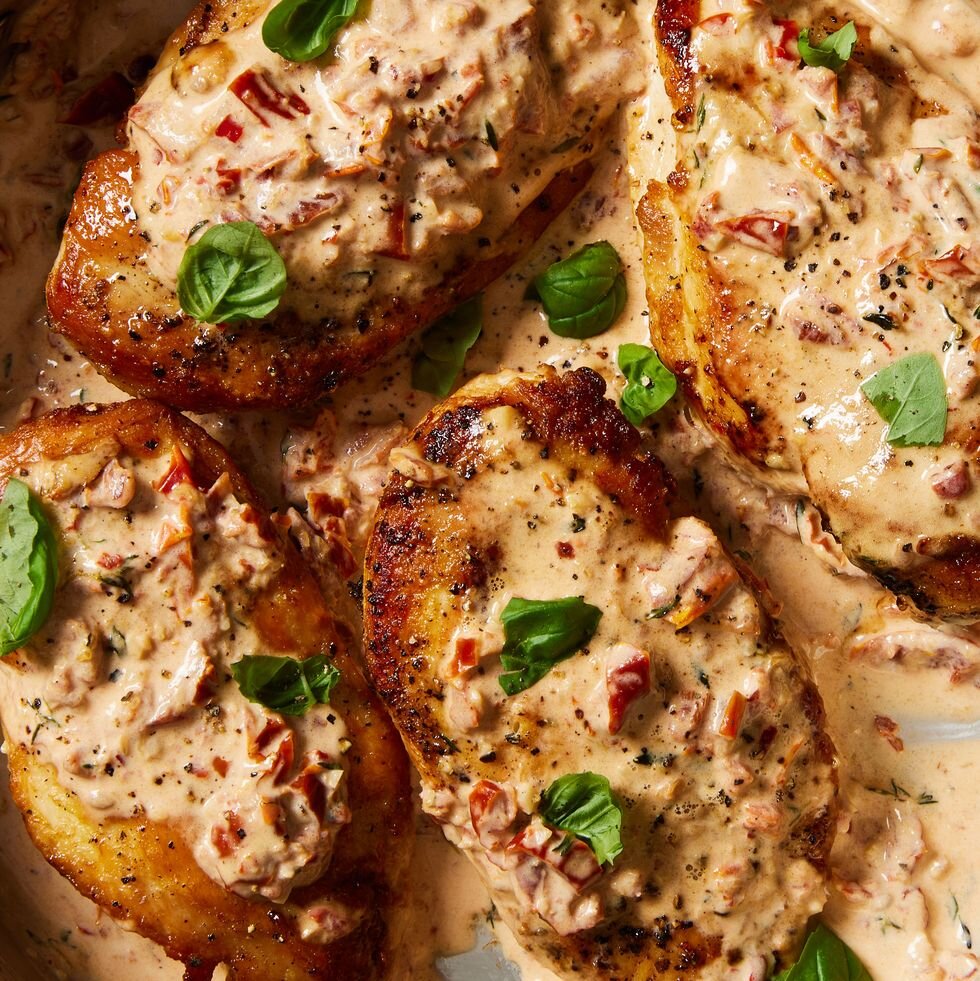 После того, как вы поджарите куриные грудки, вы приготовите простой сливочный соус из чеснока, свежего тимьяна, вяленых помидоров , куриного бульона и густых сливок, в котором обжаренная курица готовится в духовке, чтобы она впитала весь аромат. Эту технику следует запомнить, если вы ее еще не знаете: обжарьте курицу до золотистого цвета, приготовьте соус из куриных капель (слейте примерно половину), а затем добавьте курицу обратно и зап