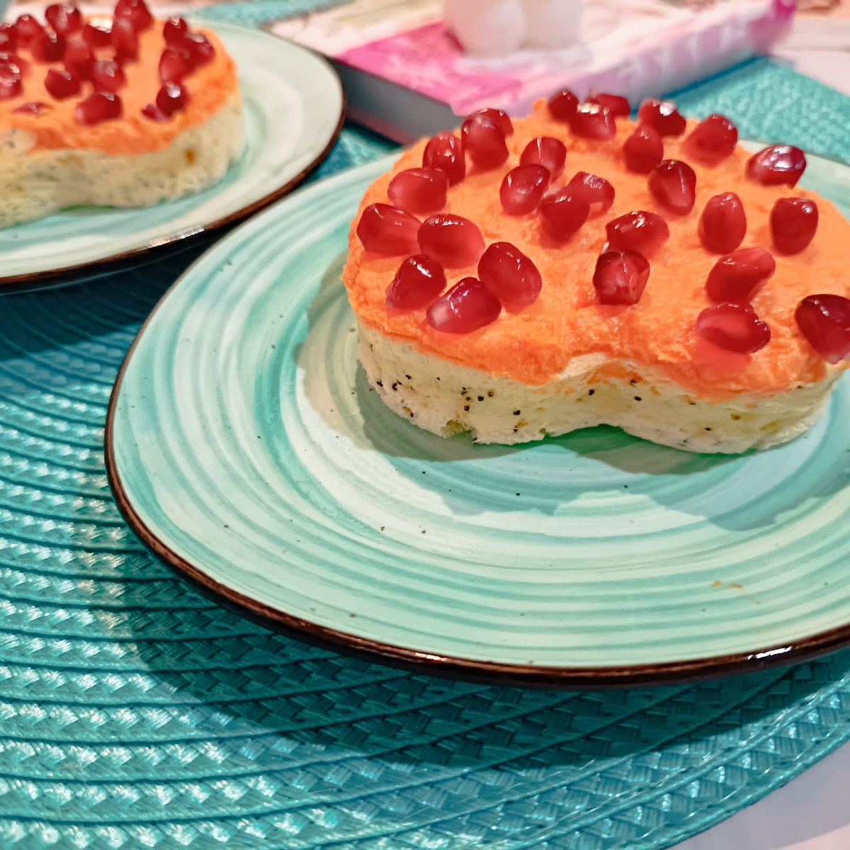 Для теста: Творог 160 гр (столько было, можно 150-200гр) + Яйцо 1 шт + по щепотке мака, стевии и соды = тщательно смешать или пробить блендером. Мак добавила сухой для крапинок, на вкусе не отразилось и на зубах не хрустело ) Поместить тесто в формочку или в два сердца, как у меня и выпекать минуты 3-4 в СВЧ* на max мощности. В это время приготовить заливку.