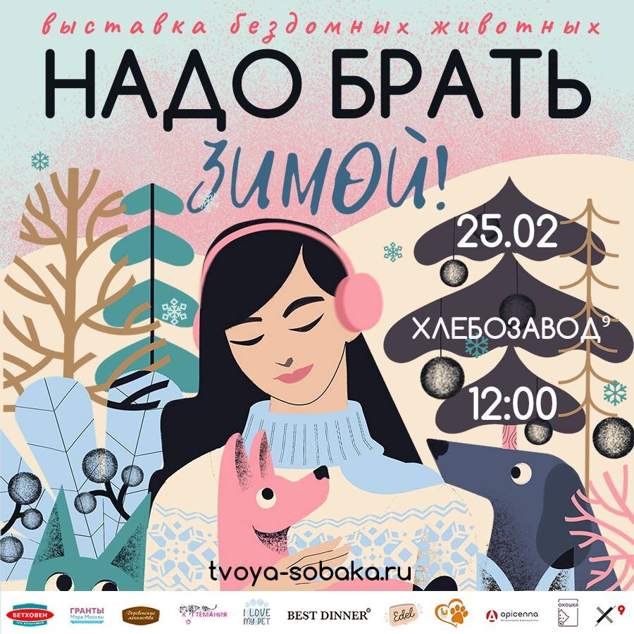 Москва! Репост!     25 февраля 2024 года приглашаем вас на нашу уже ставшую традиционной выставку бездомных животных #НадоБратьЗимой2024     В пространстве БОЙЛЕРНАЯ на территории Хлебозавода⁹ соберутся пёсики и котики из приютов!  Хвостатые участники доброжелательно настроены по отношению к людям, здоровы, привиты, стерилизованы и все они ищут дом! Животные передаются в семьи абсолютно бесплатно, но только по договору, так что не забудьте взять с собой паспорт.  Если у вас нет возможности забрать питомца домой, но вы хотите помочь, то это легко сделать: можно принести подарки для жителей приютов. Они будут рады сухому корму, консервам, поводкам и ошейникам, мискам, игрушкам, лекарствам.  Также на выставке вы узнаете, как можно помогать бездомным животным в приюте или удаленно.  На благотворительном маркете вы сможете приобрести сувениры и аксессуары, все вырученные средства от продажи которых будут направлены на помощь бездомным животным.  Приходите и вы поймете, что Надо Брать!!!