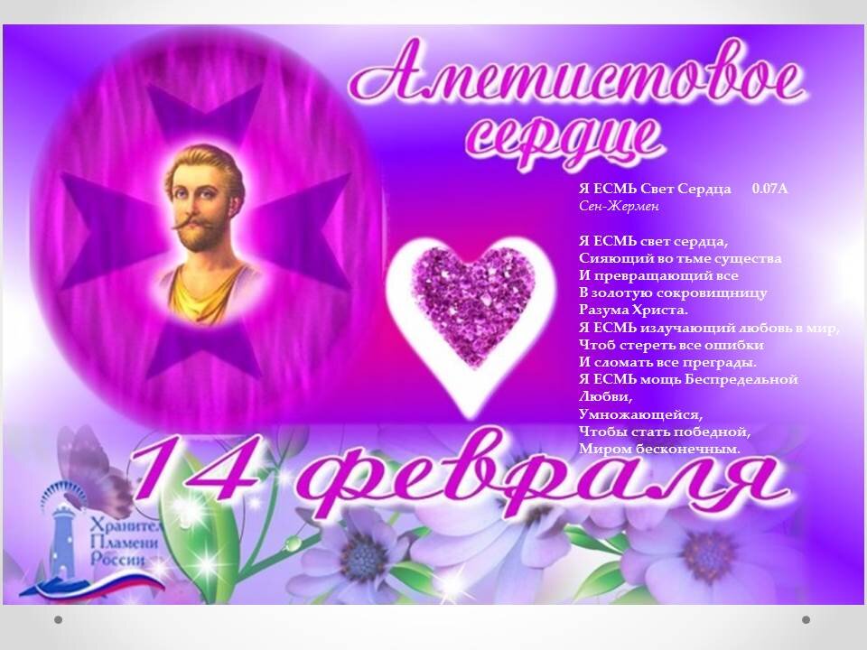 Сен-Жермен в этот день дарит нам величайшую диспенсацию! В ответ на то, что мы прочитаем веление 0.07А «Я ЕСМЬ Свет сердца» 33 раза, он может наложить Аметистовое сердце на наше физическое сердце! Многие наши проблемы в отношения приходят от того, что в сердце скопилась карма (обиды, зависть, ревность и др.), которая закрывает нам глаза на Истину! Сен-Жермен дарит нам Аметистовое сердце, которое может быть фокусом Фиолетового Пламени постоянно и трансмутировать, растворять все наши камни в сердце (зависть, ревность, ненависть, обиды, идолопоклонство, духовную слепоту, черствость, гордыню, чрезмерную любовь к себе и многие другие).