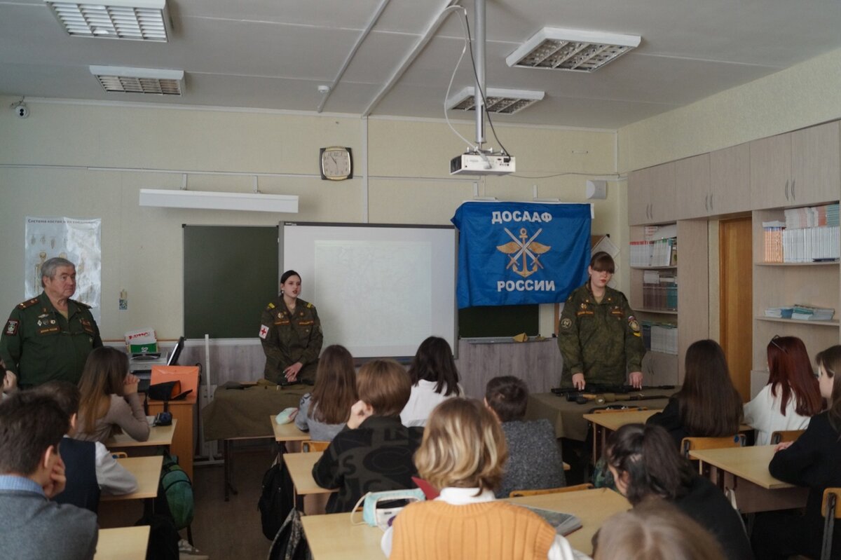 Курсанты военно-патриотического клуба «Юный автомобилист» продемонстрировали старшеклассникам оружие времен Великой Отечественной войны, провели мастер-класс по разборке/сборке автомата Калашникова. Олег Михайлович ответил на вопросы ребят, рассказал о работе ВПК «Юный автомобилист» и Самарской объединенной технической школы ДОСААФ России.