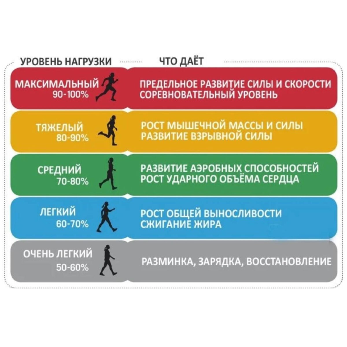 • Максимальная - уровень нагрузки «максимальный» • Анаэробная - уровень нагрузки «тяжелый» • Аэробная - уровень нагрузки «средний» • Жиросжигающая - уровень нагрузки «легкий» • Восстановительная - уровень нагрузки «очень легкий»