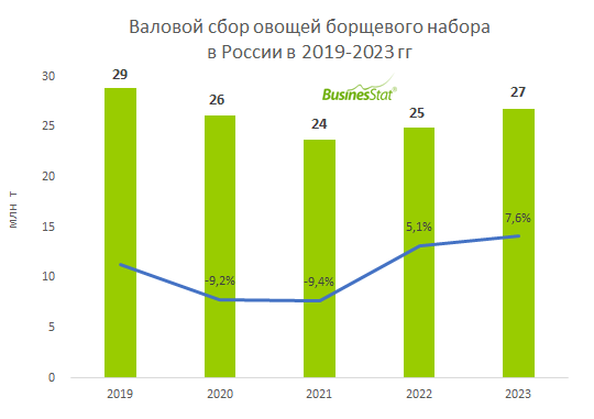 В 2023 г валовой сбор овощей борщевого набора в России вырос на 7,6% и составил 27 млн т.